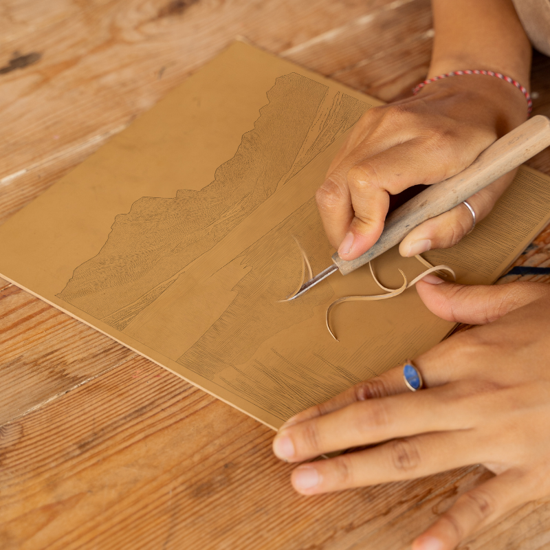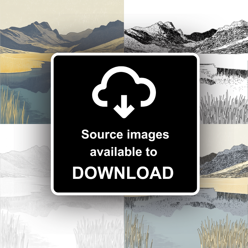 Capture the tranquil beauty of the Lake District with this striking lino-print style artwork, 'Blea Tarn reflections of Langdales'. Skillfully rendered with crisp, expressive lines, the print depicts the serene waters of Blea Tarn mirroring the dramatic silhouette of the Langdale Pikes. The layered composition features deep blue and slate grey peaks softened by gentle washes of cream and golden yellow reeds, reflecting in the stillness of the tarn below. Foreground reeds frame the lower edge, adding depth and texture as they sway against the vibrant water. The soft horizon and subtle sky contrast perfectly with the rugged mountains, evoking a sense of peaceful isolation and timeless natural splendour unique to Cumbria's landscape. Available framed in classic black or white and in two square sizes, this print is ideal for anyone seeking a piece of the Lake District's awe-inspiring scenery. For creatives, a unique digital option allows you to purchase the source sketches and linework, perfect for those wanting to try their hand at making a personal lino print inspired by this iconic view.