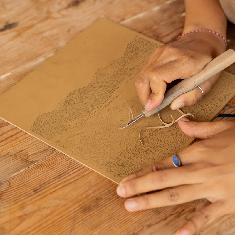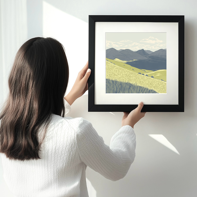 Celebrate the striking beauty of the Lake District with this unique lino-print style artwork, featuring the iconic skyline of Blencathra. Expertly created with meticulous detail, the image captures the majestic sweep of Blencathra’s ridges as they rise above tranquil waters, all framed by gently rolling hills in the foreground. The classic hand-carved texture is evident in the fine lines of the moorland grasses, while subtle shading is used to depict the serene lake and the gentle contours of distant peaks. The artwork’s soothing palette of cool blues and gentle yellows invites a sense of calm and connection to nature, making it a perfect centrepiece for any home or office. Available as a framed print in both 36cm and 46cm square options, finished in either black or white framing for a contemporary touch. For those inspired by creativity, our exclusive digital download option provides access to the source line drawings and sketches—ideal for making your very own lino print at home. Part of our celebrated Lake District collection, this piece is a must-have for lovers of British landscapes, printmaking enthusiasts, or anyone seeking a stylish tribute to the breath-taking scenery of Cumbria.