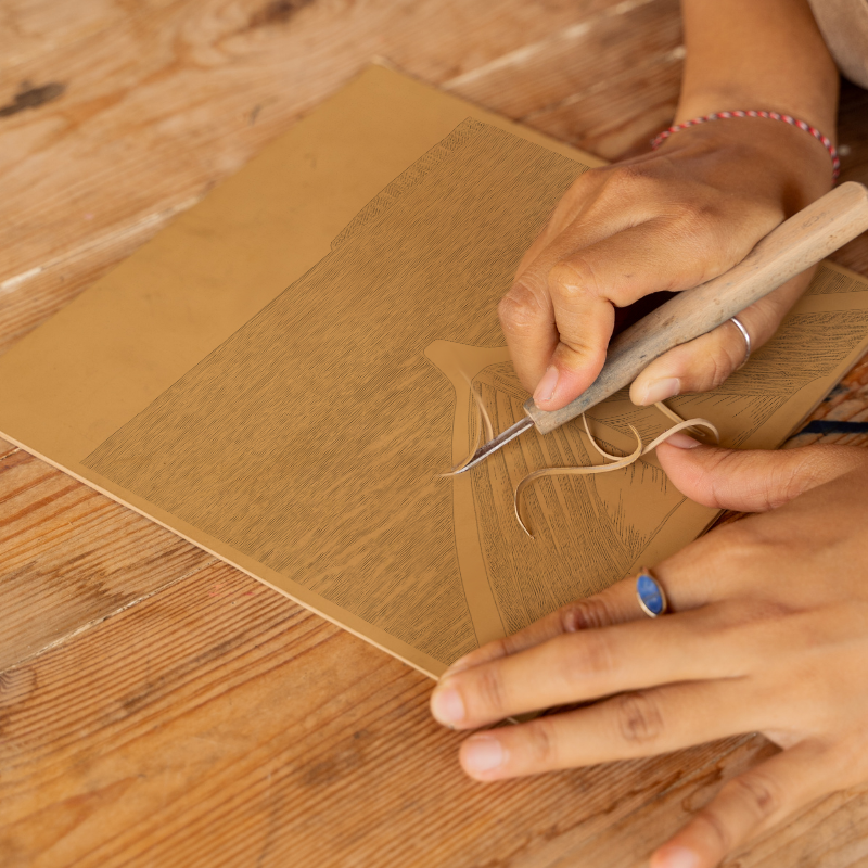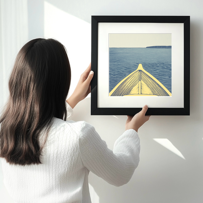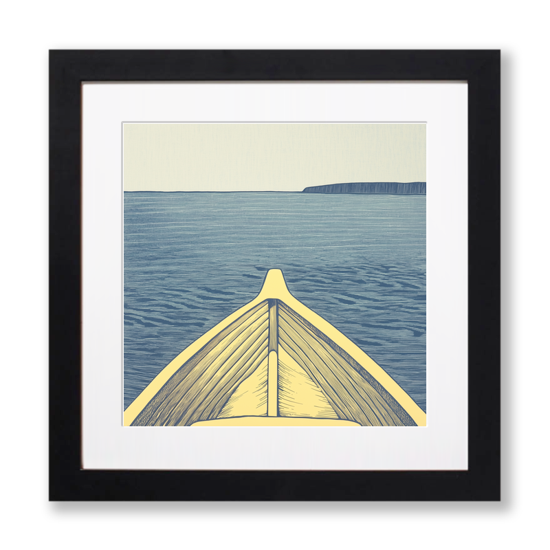 Immerse yourself in the serene beauty of the Lake District with this striking lino-print style artwork, featuring the bow of a wooden boat elegantly cutting through tranquil, rippling water. This meticulously crafted print captures the viewpoint from inside the boat, inviting you to embark on a peaceful journey across a vast, open lake. The distinctive lines and textures mimic the traditional linocut technique, with fine crosshatching and wave patterns lending an artisanal, hand-printed feel. The composition draws your eye towards the distant shoreline, where rolling hills and landmasses are gently silhouetted against a soft, light sky. The artwork boasts a harmonious palette of muted blues and gentle creams, evoking a sense of calm and timelessness. Perfectly suited for lovers of the outdoors, this piece complements modern and classic interiors alike. Available framed in black or white, in 36cm or 46cm square sizes, it's ready to take pride of place in any home. For creative spirits, we offer the unique option to purchase and download the source images, including line drawings and sketches, allowing you to create your own lino print at home. Bring the tranquillity and adventure of the Lake District indoors with this beautifully framed print.
