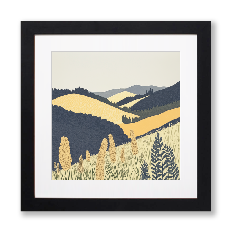 Embrace the tranquil beauty of the Lake District with this exquisite lino-print style artwork, 'Bracken Covered Slopes'. This stunning piece captures the sweeping, undulating hills typical of the region, layered gracefully in a harmonious palette of soft golds, gentle creams, muted greens and deep slate blues. The composition is beautifully balanced: bold silhouettes of bracken and wild grasses fill the foreground with delicate botanical detail, while the midground unfolds into sunlit slopes and richly patterned hillsides. Pine trees and distant rolling hills evoke a peaceful sense of depth, leading the eye into the serene, expansive background. The characteristic lino-print mark-making is evident in the textural detail of the vegetation and hills, offering a hand-crafted artistry and tactile warmth. Perfectly finished in your choice of a black or white frame and available in 36cm or 46cm squares, this print is a sophisticated homage to iconic Lake District landscapes. As a unique feature, you can also purchase the downloadable source files—sketches and line drawings—so you can create your own art at home, whether for lino printing or colouring. Bring a touch of natural elegance and creative inspiration into your living space with this exceptional artwork.