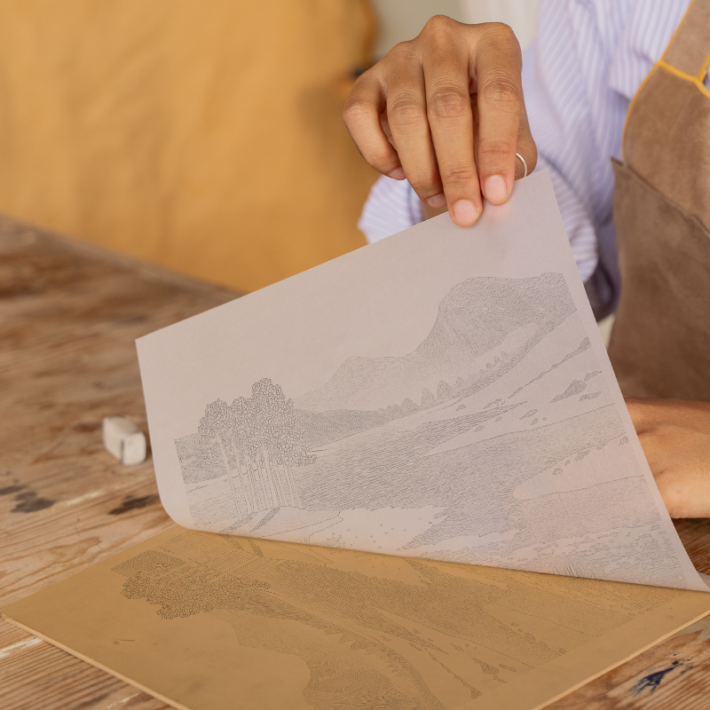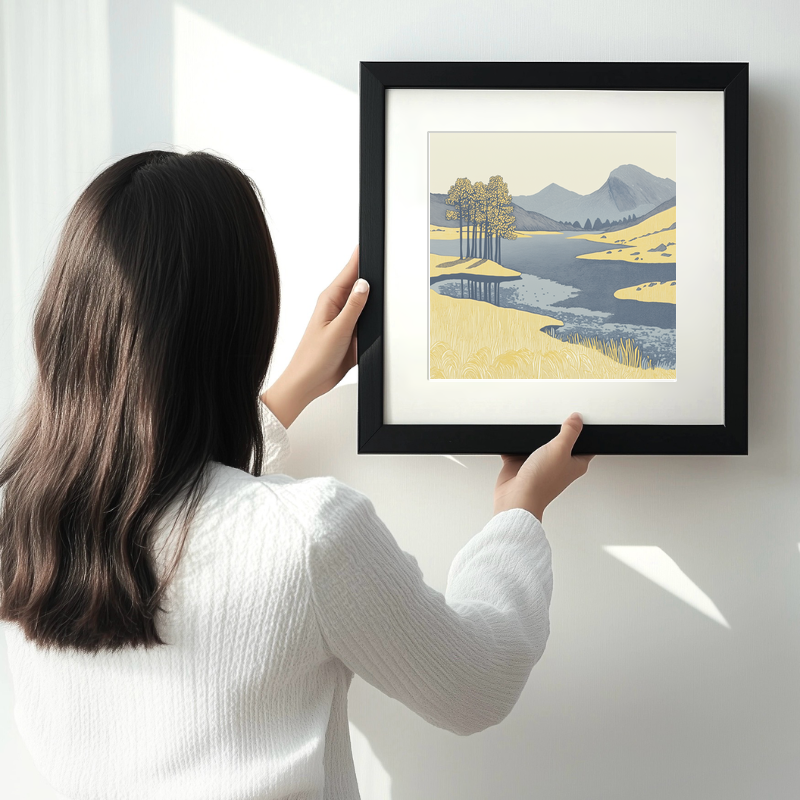 Celebrate the tranquil beauty of the Lake District with our hand-crafted lino-print style artwork featuring the iconic Buttermere lone pines. This evocative piece captures a serene lakeside scene, where a small cluster of slender pines stands gracefully by the water's edge. The graphic style uses finely etched lines and subtle shading, drawing the eye to the delicate textures of grasses, tree bark, and rippling water. The distant fells and hills are rendered in cool, understated blues, contrasting beautifully with soft yellow tones depicting the shore and foliage. The reflection of the trees in the still lake adds to the peaceful atmosphere, while the rolling hills and mountains create a sense of timeless grandeur. Available professionally framed in sleek black or white, in either 36cm or 46cm square formats, this artwork makes a striking addition to any room. For creative enthusiasts, we also offer exclusive access to the source images, including line drawings and preparatory sketches, perfect for those who wish to create their own lino prints at home. Whether for your own collection or as a thoughtful gift, this print brings the calm and natural splendour of the Lake District into your living space.