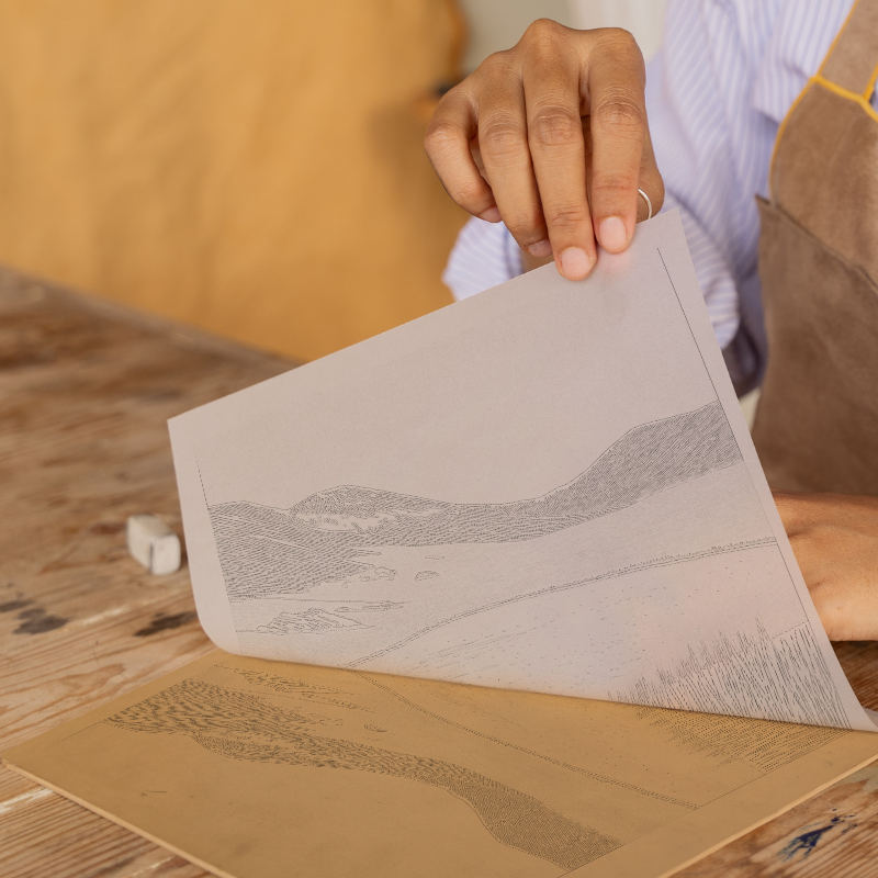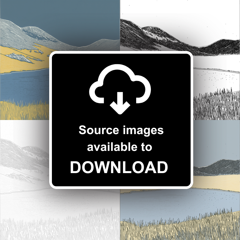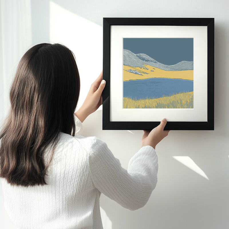 Bring the serene beauty of the Lake District into your home with this stunning lino-print style artwork of Devoke Water, one of the region’s most remote and tranquil tarns. This exclusive piece captures the sweeping, untamed landscape in bold, stylised lines and a rich, natural palette. The foreground features delicate golden grasses, rendered in fine detail, gently curving towards the cool, blue waters of the tarn. Rolling yellow hills rise behind the lake, dotted with distinctive etched rocks and crags that echo the wild character of this striking landscape. The distant fells are depicted in fine crosshatched lines of blue-grey, contrasting with the expansive, dusky blue sky above. This print is available professionally framed in either black or white, in 36cm or 46cm square sizes, perfect for any contemporary or rustic interior. For those who wish to get creative, we also offer a unique option: download the original line drawings, sketches, and source images to craft your own lino print at home—a fantastic gift for art lovers and Lake District enthusiasts alike. Add a touch of modern British landscape art to your walls, or enjoy the process of creating your own masterpiece with our downloadable files.