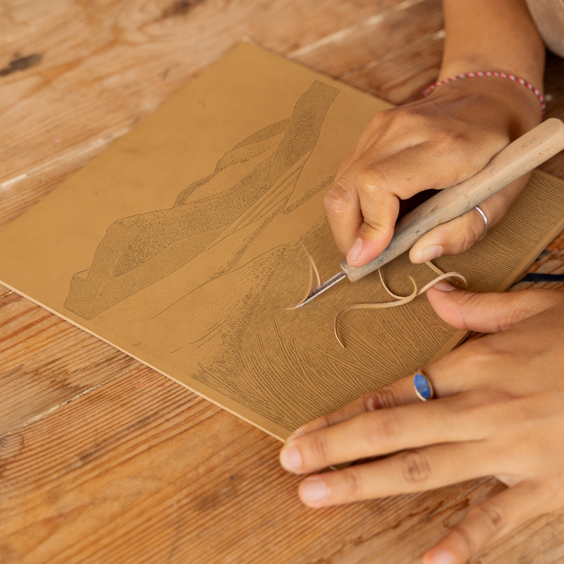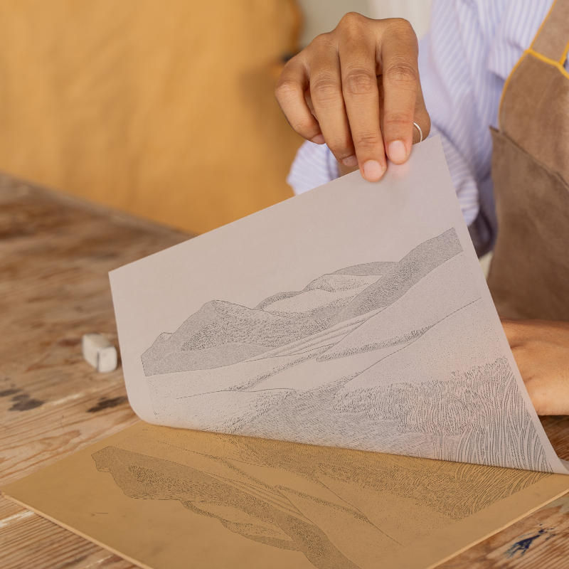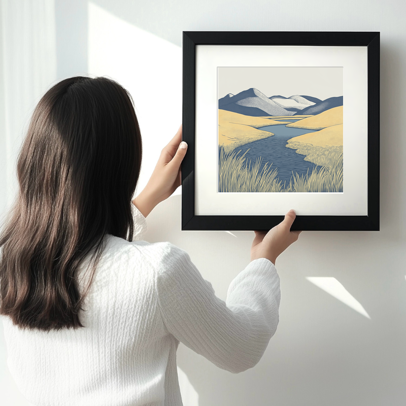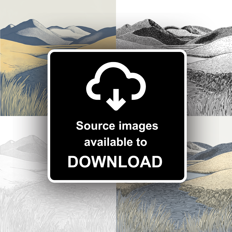 This captivating piece depicts Devoke Water, one of the Lake District’s most remote and magical tarns, interpreted in a refined lino-print style. Rendered with meticulous crosshatch and stippled texture, the artwork beautifully captures the serene seclusion of Devoke Water. In the foreground, softly flowing water winds through long reeds and grasses, inviting the eye towards gently rolling golden hills. Behind, the tranquil scene rises into a sweep of blue-grey mountains, whose contours are delicately patterned to evoke the ruggedness and tranquillity of the Lakeland fells. The entire composition is framed by an open sky, lending a bright and expansive feel which invites contemplation and calm. The pared-back colour palette of muted golds, creams, and slate blues adds a timeless, contemporary edge to this landscape, making it perfect for a modern home or a lover of traditional print arts. Available framed in black or white and in two square sizes, you can choose to display this unique vision of the Lake District or, for a special creative touch, download the source material – including linework and sketches – to craft your own version as a lino print. This piece pays tribute to the untamed beauty of Devoke Water and brings a touch of wilderness into any space.