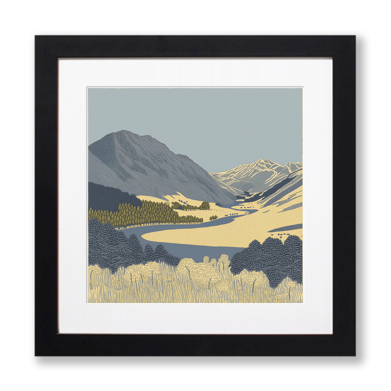 Bring the timeless beauty of the Lake District into your home with this distinctive lino-print style artwork of Dow Crag. The piece features a striking depiction of the impressive Dow Crag rising majestically in the Lake District, its textured slopes rendered in delicate blue-grey lines that echo traditional lino printing techniques. In the foreground, soft rolling fields and clustered trees in muted yellows, olives and deep blues create a harmonious, serene landscape, while the winding river leads the eye deeper into the distant, gently contoured hills. Every detail of the composition carefully captures the tranquillity and raw beauty of this iconic British landscape. Printed on high-quality paper, each piece is expertly framed in your choice of classic black or crisp white, and comes in two popular square sizes (36cm or 46cm). For a truly interactive creative experience, we uniquely offer downloadable source files of the design—including line drawings and original sketches—so you can print, adapt, or even craft your own lino-cut inspired by this celebrated view. Part of our Lake District collection, this print is both a stylish addition to any interior and a wonderful gift for art lovers, hikers, or anyone enamoured with Britain's natural wonders. Celebrate timeless artistry and the landscapes that inspire with this beautiful Dow Crag artwork.