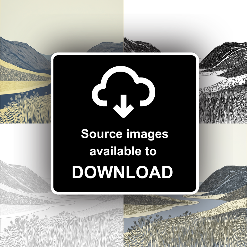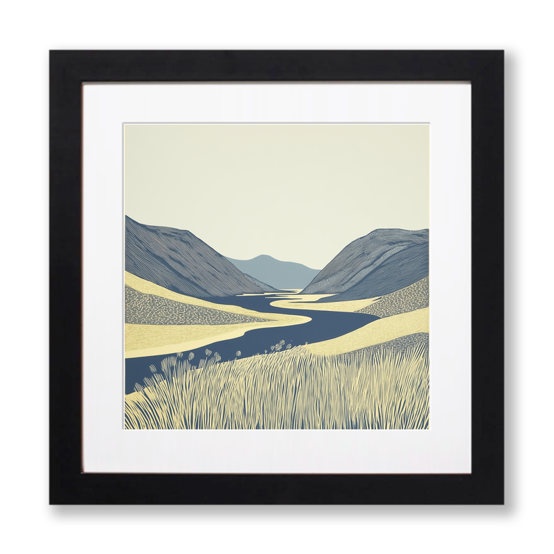 Bring the serene beauty of the Lake District into your home with this striking lino-print style artwork depicting Grasmoor. Inspired by the dramatic vistas of Cumbria, this print captures the sweeping curves and textured lines of the valley, lake, and towering hills. The foreground is alive with delicately etched grasses, drawing the eye towards the meandering river or lake that carves its way through the scene, framed by the iconic fells of the region. The palette is calm and harmonious, dominated by cool blues and gentle creams, evoking the quiet, contemplative atmosphere one finds in the heart of nature. Each ridge and contour in the landscape is rendered in a timeless, hand-crafted style that references traditional printmaking, making this piece both classic and contemporary. Available framed in your choice of sleek black or clean white, and in two sizes (36cm or 46cm square), this print complements modern or rustic interiors alike. Prefer to get hands-on? Opt for our unique download package, which includes source images, line drawings, and original sketches—perfect for crafting your very own lino print masterpiece at home. An ideal gift for art lovers, walkers, or anyone who cherishes the English countryside, this artwork is a celebration of one of the Lake District’s most beloved vistas.