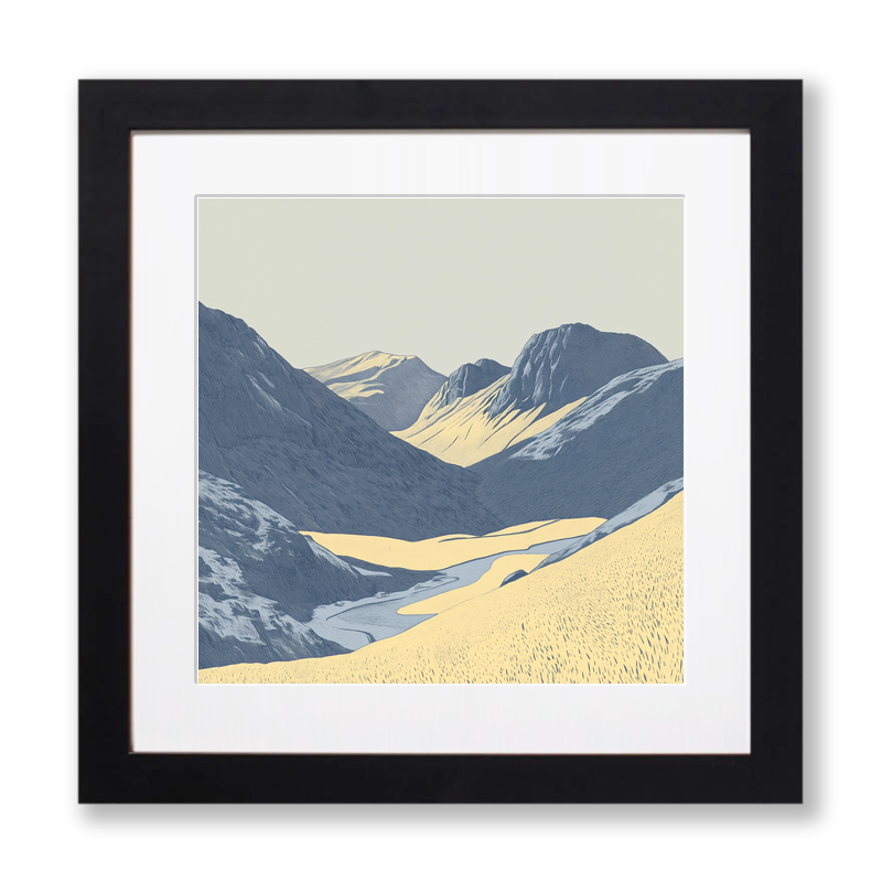 Bring the striking beauty of the Lake District into your home with this meticulously crafted lino-print style artwork featuring Great Gable. This piece captures the serene majesty of one of the region's most iconic peaks, rendered with intricate lines that evoke the timeless techniques of traditional printmaking. Shades of soft blue and gentle gold sweep across the rugged slopes and grassy valleys, creating a harmonious balance between light and shadow. The composition leads your eye from the quiet, meandering river in the foreground, across expanses of textured grassland, and up towards the imposing, sunlit ridges of Great Gable. The detailed hatching and stippling give the scene a hand-finished, tactile quality that offers enduring appeal. Perfect for lovers of the outdoors, this artwork is available framed in either sophisticated black or pure white, and comes in two square sizes – 36cm or 46cm – to suit your space.