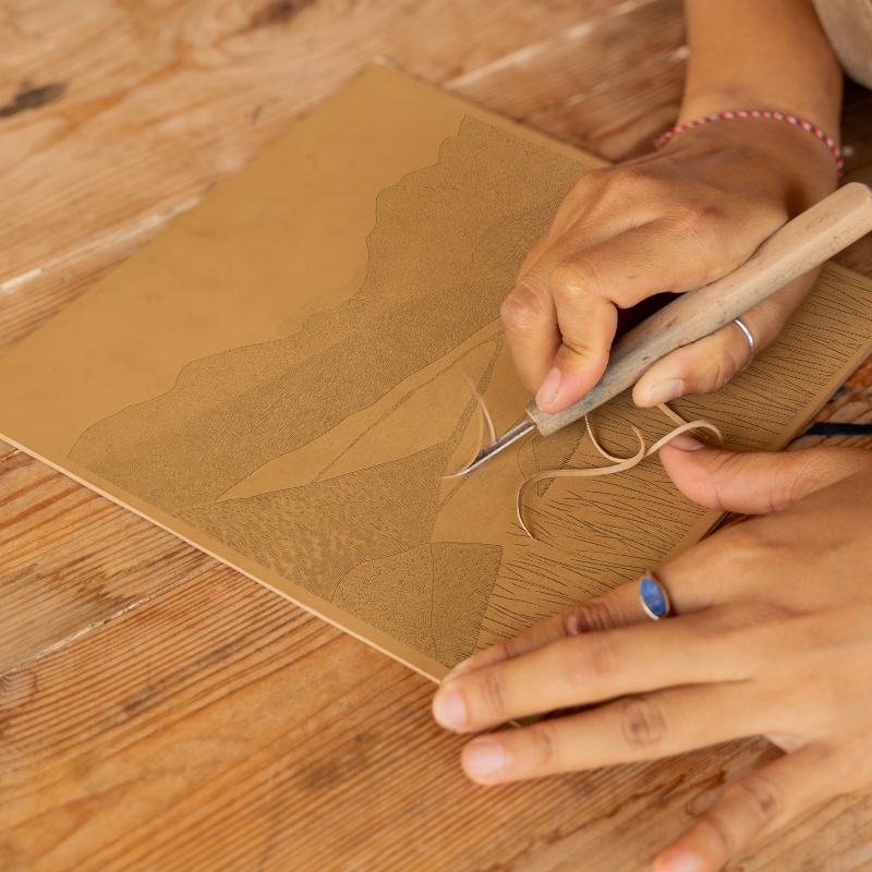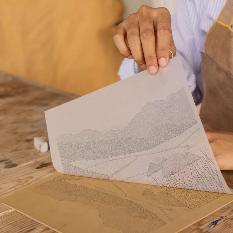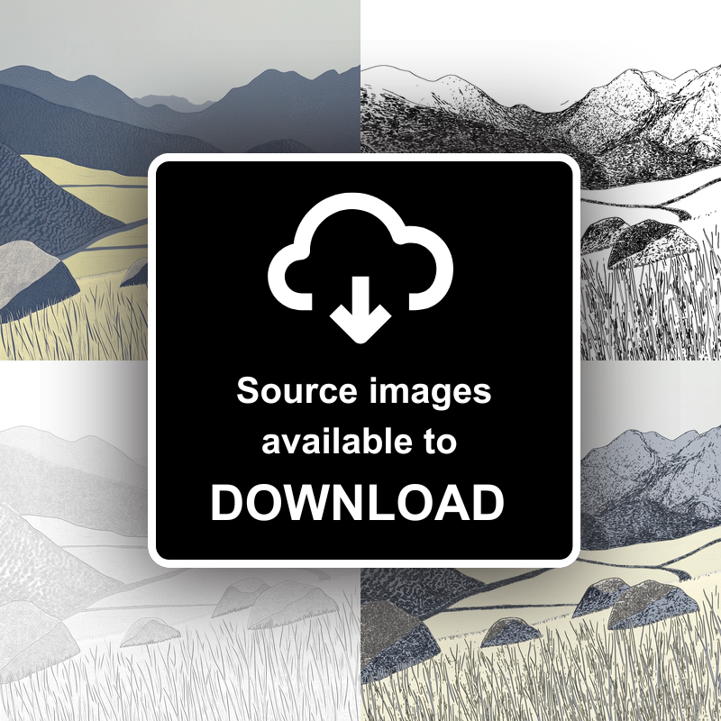 Immerse yourself in the tranquil beauty of the Lake District with this contemporary lino-print style artwork, showcasing the serene floor of Great Langdale Valley. This evocative print captures the sweeping expanse of the valley, with gently undulating hills layered in muted slate blue-grey tones that recede into the horizon. The composition features a foreground dotted with large, textured boulders nestled amongst delicately rendered grasses, their linear forms giving a sense of movement and depth. Pale, creamy meadows stretch across the midground, intersected with winding pathways that lead the viewer’s eye through the landscape and hint at the story of this well-trodden valley. Above, the distant fells rise peacefully, their soft contours layered with the artist’s signature mark-making that evokes the technique of hand-carved lino printing. The subtle contrast between light and shadow, and the harmonious palette of cool blues and dusky yellows, conjure the calm, fresh air of a summer’s day in the Cumbrian countryside. Available framed in either classic black or white, and in two perfect square sizes (36cm and 46cm), this piece is an elegant addition to any modern or traditional space. For creative spirits, we also offer the unique option to purchase and download the source image, including the original line drawing and sketches, so you can create your own hand-made lino print inspired by Great Langdale.