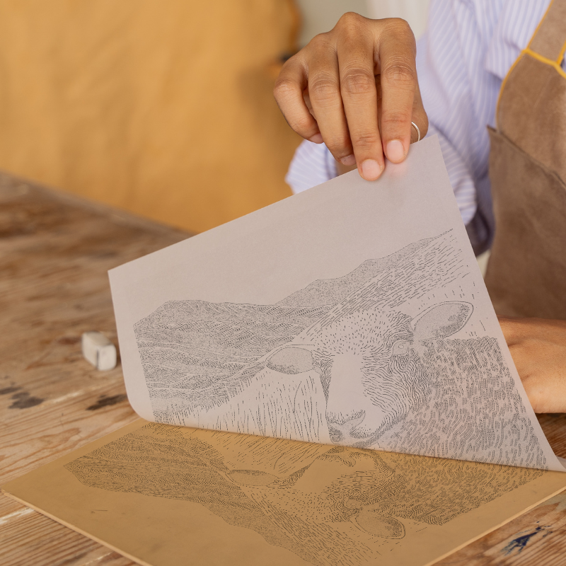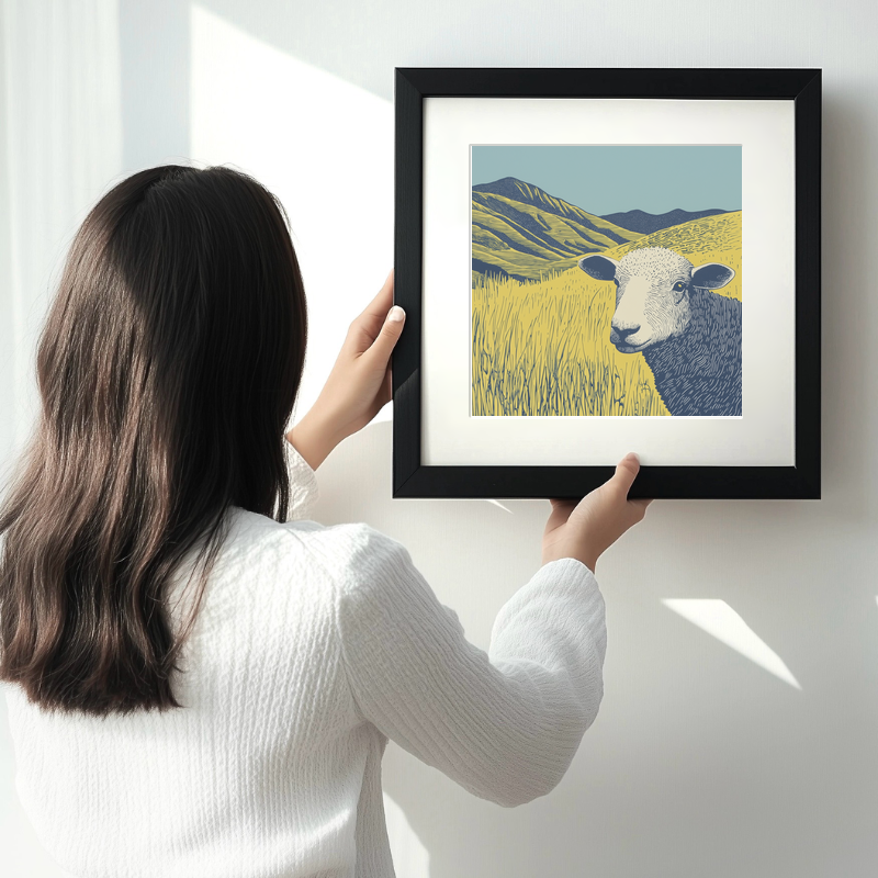 Capture the rural charm of the Lake District with this striking lino-print style portrait of a Herdwick sheep, part of our exclusive Lake District collection. Meticulously hand-drawn and digitally printed, this piece offers a bold, graphic interpretation of the region’s most iconic animal. The artwork features a close-up Herdwick sheep in the foreground, its distinctive white face and textured wool rendered in expressive linework. Set against rolling fells beneath a vast blue sky, waves of textured golden grasses fill the landscape. The stylised hills in deep navy blue and soft yellow evoke the unique scenery of the Lake District, bringing a sense of tranquillity and rugged beauty to any home. Each print is professionally framed in your choice of modern black or white, and available in 36cm or 46cm square sizes. For creative souls, we also offer an exclusive digital download: receive the source line drawings and preparatory sketches, so you can craft your own lino prints at home. This unique option is perfect for art lovers and DIY enthusiasts seeking a hands-on artistic experience. Whether as a gift or a treat for yourself, this Herdwick sheep print celebrates heritage, nature, and creativity in one meaningful artwork.