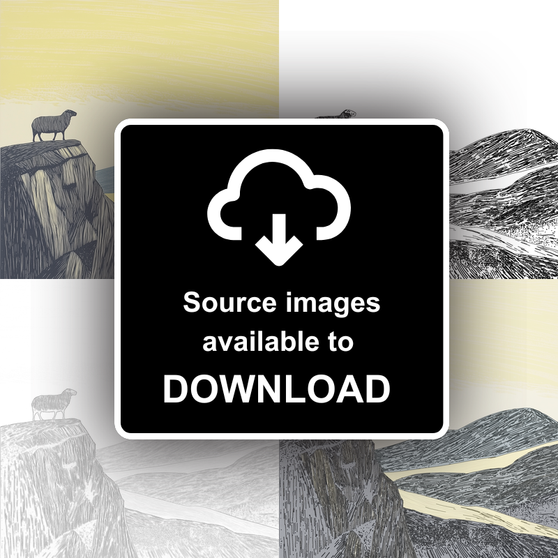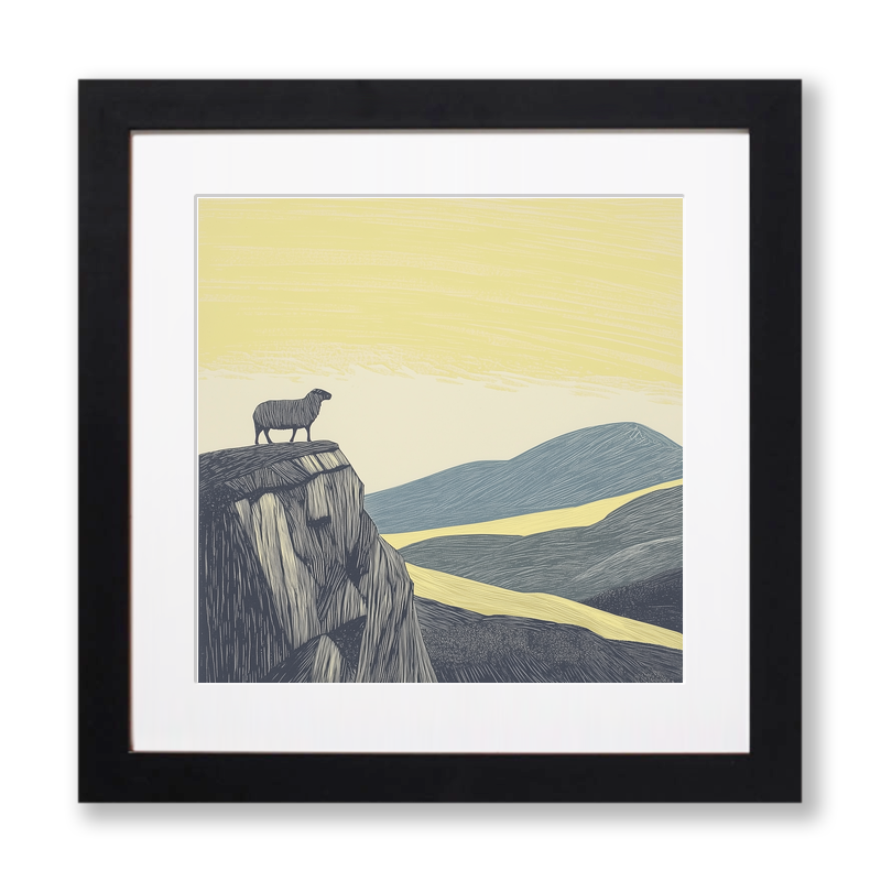 Bring the spirit of the Lake District into your home with this striking lino-print style artwork, featuring the iconic Herdwick sheep in profile. The piece beautifully captures the solitude and resilience of this beloved breed, standing proudly atop a rocky rise and surveying the sweeping landscape beyond. Executed in graceful, fine-lined textures, the composition conjures the rugged charm of Cumbria’s rolling hills, with the sheep silhouetted against a horizon of sun-washed skies and undulating ridges. The gentle pastel yellows of the sky blend seamlessly with pale blues and greys in the distant fells, creating a sense of expansive calm and natural majesty. Each print is available in a choice of sleek black or white framing, sized 36cm or 46cm square—perfect for any space in need of a touch of pastoral beauty. For creative enthusiasts, we offer a unique digital download of the original source images—line drawings and preparatory sketches—so you can craft your own lino prints at home. Ideal for gifting, or as a serene statement piece for your own walls, this artwork is a loving homage to the Lake District and its enduring wildlife.