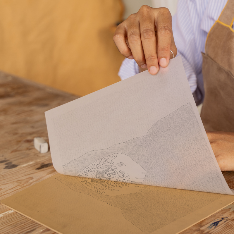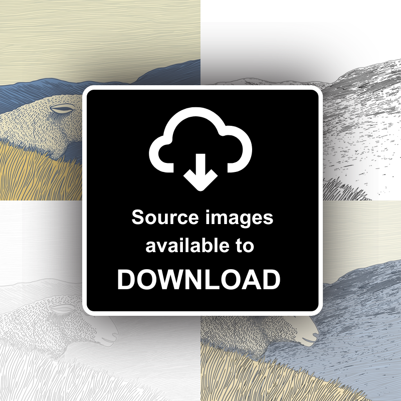 Celebrate the beauty of the Lake District with this striking lino-print style artwork featuring a classic Herdwick sheep in silhouette. This unique piece captures the essence of the Cumbrian landscape, presenting a confident Herdwick sheep in graceful profile as it stands atop a windswept rise. The bold, graphic lines of the sheep’s wool contrast beautifully against the flowing contours of the hills behind, rendered in deep slate blue. The sky appears soft and luminous, created with gentle linear textures in a pale cream, echoing traditional printmaking techniques. Golden ochre grass, etched with stylised mark-making, sweeps up the hillside, adding warmth and movement to the composition.