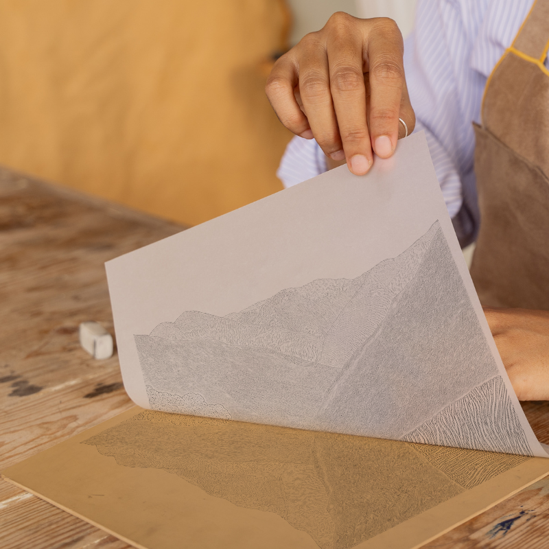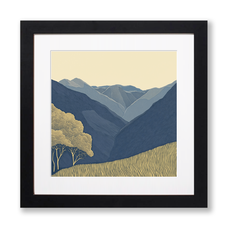 Bring the serene beauty of the Lake District into your home with this striking lino-print style artwork depicting High Stile. This piece captures the grandeur of the fells with undulating layers of textured blue mountains receding into the distance, under a softly glowing cream sky. The foreground is graced by a golden sweep of stylised grasses and delicately rendered yellow trees, their outlines and foliage intricately detailed to evoke the tactile quality of hand-carved lino prints. The composition expertly balances bold, simple massing of wilderness shapes with fine, rhythmic linework that draws the eye across the landscape. Each element from the billowing crowns of the trees to the rugged mountain slopes has been thoughtfully illustrated to evoke a sense of calm and spaciousness, typical of the iconic Lake District scenery. Available framed in classic black or white, and presented in a choice of 36cm or 46cm square, this artwork will complement both traditional and contemporary interiors. For creative souls, we also offer an exclusive downloadable pack of the source images, line drawings, and preparatory sketches—perfect for crafting your own print or colouring project at home. This piece is part of our Lake District collection, making it an ideal gift for lovers of British landscapes and timeless printmaking artistry.