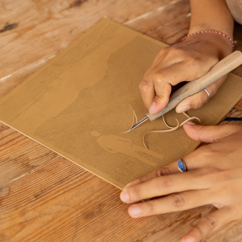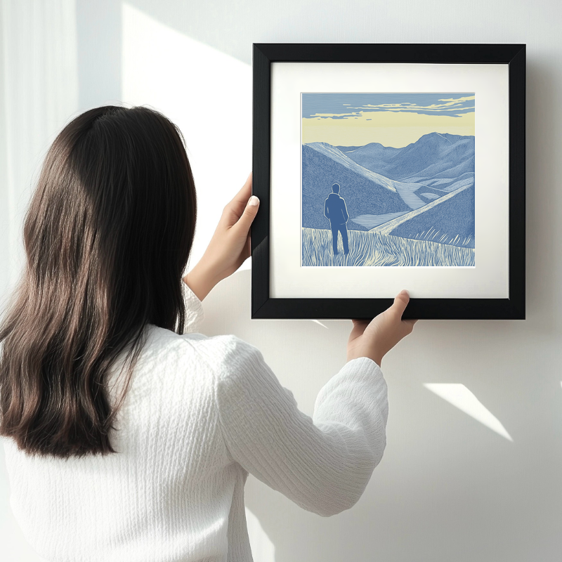 Bring the timeless beauty of the Lake District into your home with this stunning lino-print style artwork, capturing a solitary hiker silhouetted against the rolling fells at sunset. The image is finely detailed, with the foreground dominated by the bold, graphic figure of the hiker, standing amongst windswept grasses, gazing out over undulating blue-tinged hills and valleys. The intricate linework evokes the tactile quality of traditional lino printing, with each stroke contributing to the contoured forms of the landscape. Above, a soft yellow sky glows, with streaked clouds slowly fading as evening sets in, perfectly balancing the tranquil blue of the hills below. This evocative scene offers a sense of calm and adventure, ideal for lovers of the outdoors and the UK’s famous fellwalking country. Each print is available in your choice of black or white frame and comes in either 36cm or 46cm square – a tasteful addition to any wall. For a truly unique experience, we also offer downloadable source images, including the original line drawings and preparatory sketches – perfect for those who wish to create their own hand-made lino print at home. Celebrate the wild spirit of the Lake District with this exclusive piece from our Lake District collection.
