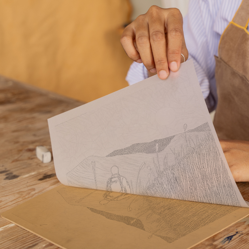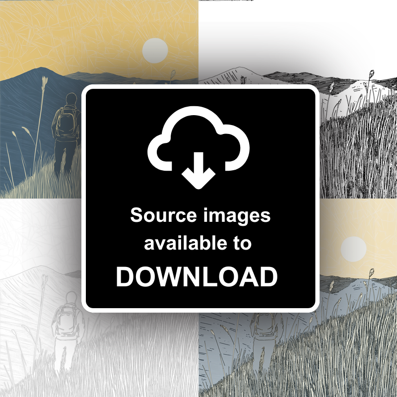 Celebrate the spirit of adventure and the peaceful beauty of the Lake District with this striking lino-print style artwork, featuring a silhouetted hiker watching the sun set over rolling fells. The piece captures a quiet yet inspiring moment: a lone figure, backpack on, stands amongst tall grasses, gazing towards distant, layered hills as the golden sun hangs low in a textured sky. Each blade of grass and contour of the landscape is rendered in delicate linear details, giving the work an authentic hand-carved appearance. The contrasting colours—a warm ochre sunset, soft off-white grasses, and inky blue hills and figure—create a vivid yet tranquil scene evocative of long days spent walking in the great outdoors. Available framed in elegant black or white to complement any décor, and in both 36cm and 46cm square sizes. For those who love to create, we offer the unique opportunity to purchase and download the original line drawings and preparatory sketches, so you can carve your own lino print at home. Part of our exclusive Lake District collection, this artwork is perfect for walkers, adventurers, and lovers of British landscapes, bringing the poetic quietness of twilight hikes into your living space.