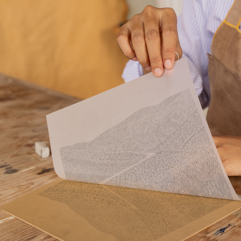 This stunning lino-print style artwork, 'Interlocking Hills', captures the timeless beauty of the Lake District landscape. The piece artfully depicts rolling, interlocking hills, their graceful curves rendered in finely carved lines that evoke movement and texture. A winding, pale path leads the viewer’s eye gently into the scene, suggesting a tranquil journey through the undulating landscape. Grassy textures in the foreground give way to deeper, soft blue-green hills in the distance, all under a serene, pale sky. A warm, stylised sun hovers above the horizon, adding a soft glow to the composition. The harmonious blend of muted blues, soft creams, and buttery yellows creates a soothing, contemporary feel, making this print a standout feature in any home or office. Available framed in either black or white and in two convenient sizes (36cm or 46cm square), it’s a versatile piece suited to any interior. For creative souls, we also offer the unique opportunity to purchase and download the source images, including line drawings and sketches, so you can create your own lino-printed artwork at home. Bring a piece of the Lake District into your life—whether as a fine art print or an inspiring creative project.