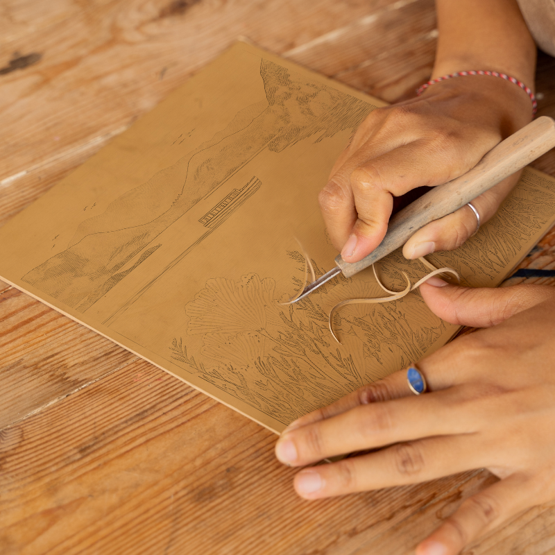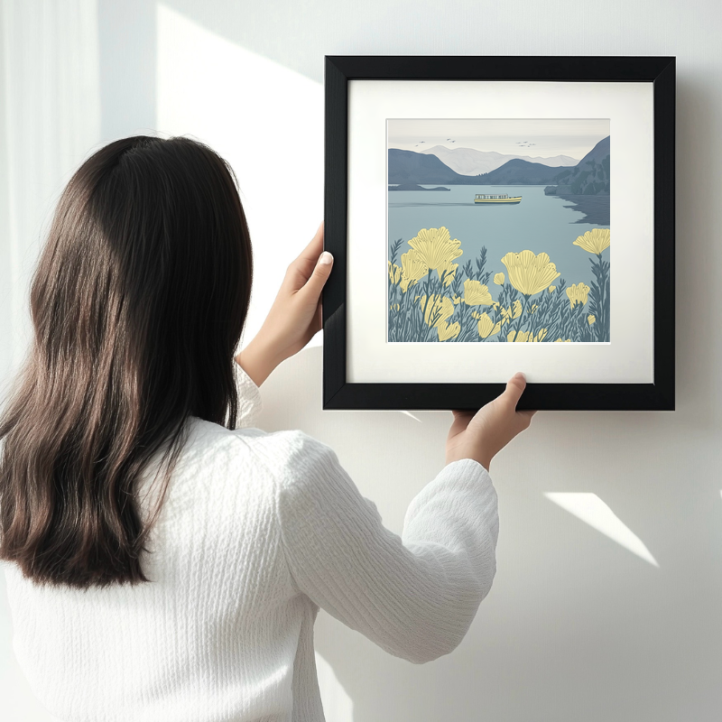 Bring the tranquil beauty of the Lake District into your home with this striking lino-print style artwork, featuring a Keswick launch gracefully crossing Derwentwater. The composition captures the serene expanse of the lake, flanked by gently undulating hills and distant misty mountains. In the foreground, delicately detailed wildflowers in soft yellow hues frame the scene, their textured petals contrasting beautifully with the cool, layered blues of the water and landscape. The iconic Keswick launch, picked out in subtle shades of cream and blue, glides effortlessly across the water, leaving gentle ripples in its wake. The sky is rendered in calm, pale tones, with faint suggestions of birds adding a peaceful, uplifting touch. This piece is part of our Lake District collection and exemplifies the charm of British countryside. Available framed in black or white, and in two square sizes (36cm and 46cm), it makes the perfect feature for your living space or a thoughtful gift for lovers of the Lakes. For those inspired to create their own art, we offer downloadable source images, sketches, and line drawings—ideal for making your own lino print masterpiece. Elevate your décor or creative projects with this unique Lake District artwork.