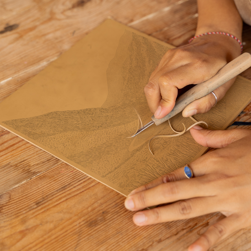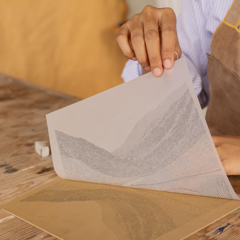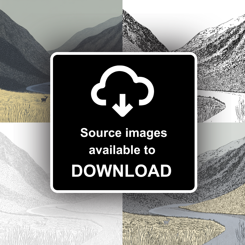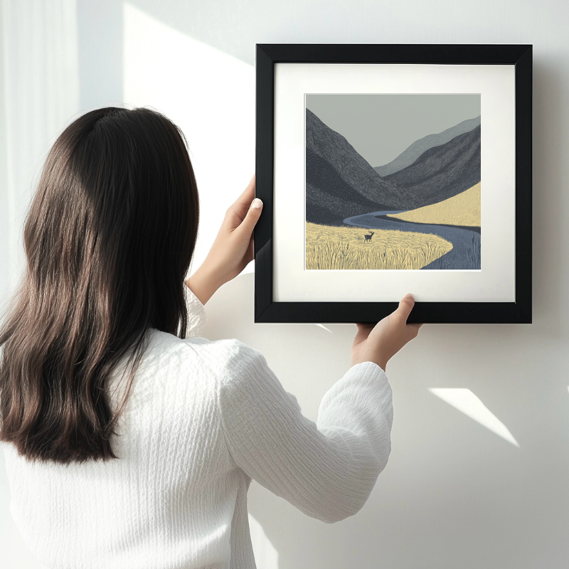 Bring the serene beauty of the Lake District into your home with this striking lino-print style artwork, capturing a tranquil view of Martindale Valley with a majestic red deer. The hand-crafted image presents a harmonious blend of sweeping hills and peaceful valleys, all rendered with the distinctive texture and depth of traditional lino printing. Softly undulating mountains in mottled blues and greys rise in the background, their patterns suggesting the gentle breeze that runs through the heart of this much-loved landscape. In the foreground, golden grasses gracefully dominate the scene, punctuated by tall, delicate reeds. The eye is naturally led to the solitary red deer, standing elegantly in the open pasture, symbolising the untamed spirit of Martindale. A winding river meanders through the scene, providing a sense of calm movement and continuity. Framed in your choice of sleek black or white and available in two square sizes (36cm or 46cm), this print makes a timeless addition to any space. For those who enjoy creativity, you can also purchase and download the original source images, including line drawings and sketches, to craft your own lino print interpretation at home. Part of our exclusive Lake District collection, this piece is perfect for nature lovers, art enthusiasts, and anyone seeking a touch of British countryside tranquillity.