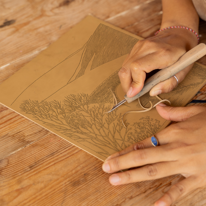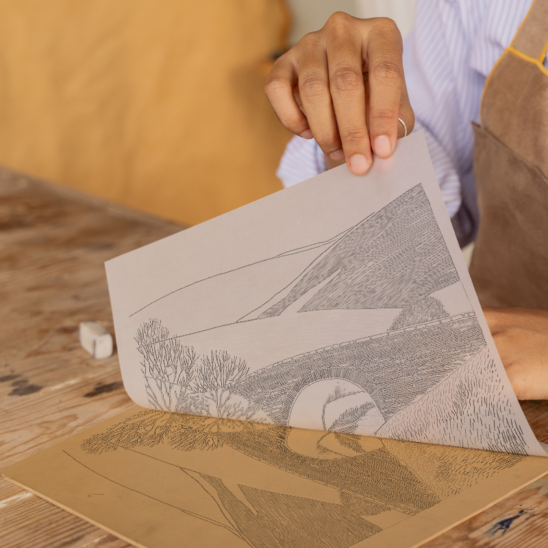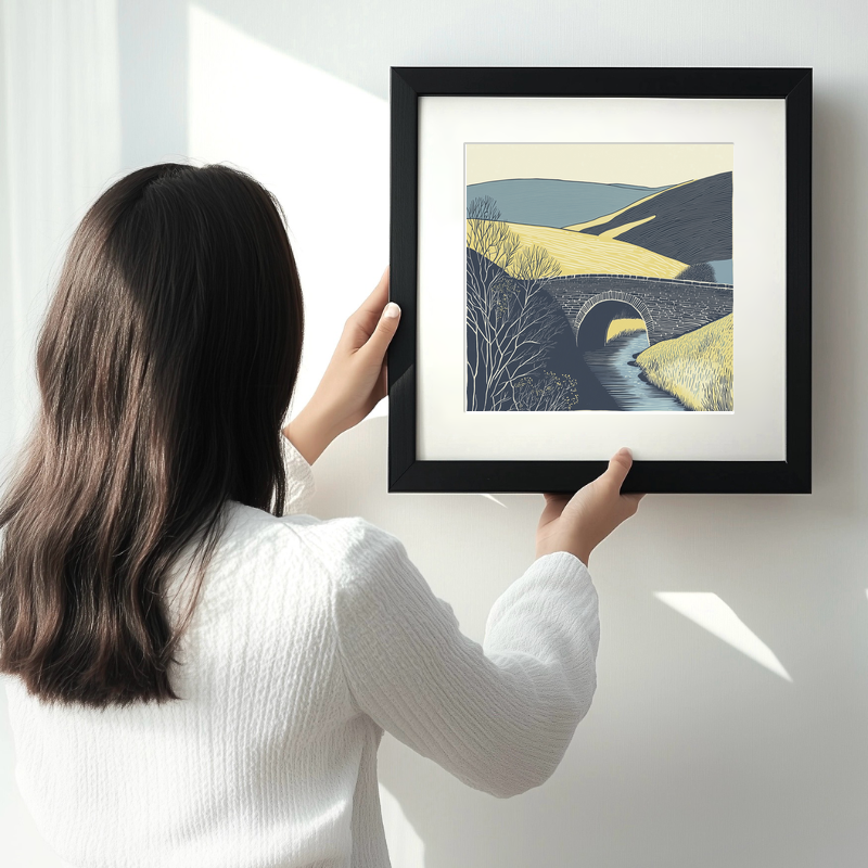 Bring the tranquil charm of the Lake District into your home with our striking lino-print style artwork featuring a classic packhorse bridge over a gentle beck. This evocative piece perfectly captures the timeless grace of a stone bridge, with meticulously detailed brickwork arching over flowing water. In the foreground, bare-branched trees add a sense of quiet stillness, while delicately drawn grasses line the waterway, leading the eye towards rolling, layered hills in the background. The slated palette of soft blues, gentle yellows, and creamy off-whites creates a calming, contemporary feel, while still honouring the heritage and natural beauty of the Lake District landscape. Available framed in black or white in both 36cm and 46cm square formats, this piece is a versatile addition to any modern or traditional interior. For those who love to create, we offer the unique opportunity to purchase and download the original source images—including finely rendered line drawings and sketches—so you can craft your own lino-print masterpiece at home. Whether as a gift or a treat for yourself, this artwork is sure to evoke memories of peaceful rambles and timeless countryside scenes.