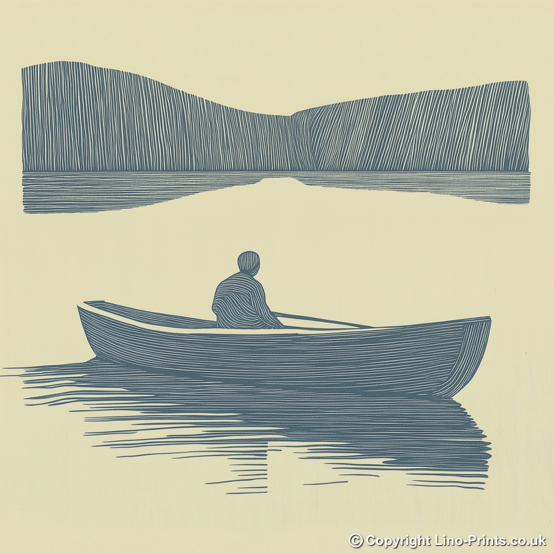 Bring the tranquil spirit of the Lake District into your home with this striking lino-print style artwork, depicting a solitary figure rowing a boat across a calm lake. Rendered in exquisite detail, the image captures the gentle ripples and glassy reflections on the water, contrasted by the flowing texture of the hills in the background. The use of clean, rhythmic lines gives the composition a sense of movement and timeless serenity, evoking the peaceful solitude of early morning on the water. Perfect for lovers of nature, the outdoors, or classic British landscapes, this artwork embodies relaxation and quiet contemplation.