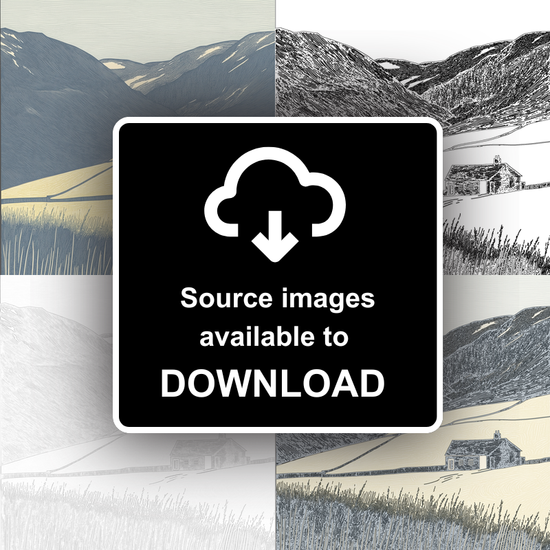 This striking lino-print style artwork captures the tranquil beauty of Place Fell, one of the Lake District’s most beloved peaks. Rendered in a contemporary palette, the image features undulating hills in muted blue-greys, their textured lines echoing the craft of traditional printmaking. In the foreground, finely detailed grasses give way to a sunlit meadow in soft, creamy yellow. A charming white-framed cottage nestles at the foot of the hills, offering a sense of serenity and welcome in this idyllic landscape. The composition’s crisp contours and gentle gradients evoke the peace and solitude found in the Lake District, making this print ideal for any lover of Britain’s natural beauty. Available framed in your choice of black or white, and in two sizes (36cm and 46cm square), it promises to become a focal point in any room. For creative souls, we also offer a unique digital package featuring the source images, line drawings, and initial sketches—perfect for those wishing to craft their own lino print at home. This piece is part of our exclusive Lake District collection, celebrating the charm and grandeur of Northern England’s iconic landscapes.