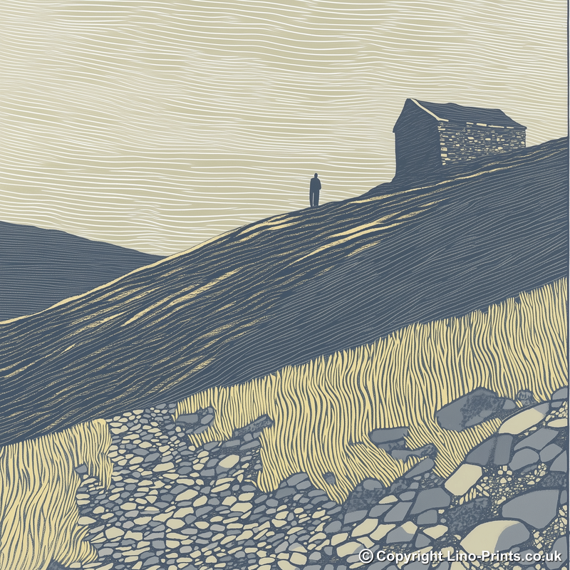 Bring the wild, evocative beauty of the Lake District into your home with this striking lino-print style artwork, expertly capturing the silhouette of a ruined building perched atop a rugged fellside. This contemporary piece features a dramatic hillside climbing from the foreground, rendered in textured lines and evocative patterns reminiscent of traditional linocut techniques. Stones and tussocks of grass nestle on the slope’s lower edge, leading the eye upwards across the windswept fell. A solitary figure stands beside a ruined stone structure, both cast in shadow, creating a sense of solitude and timelessness. The layered, undulating lines of the sky and land invoke the ever-changing moods of the Lakes, with a muted yet harmonious palette of slate blue-greys, cream, and soft beige. The contrast between the sharp lines of the landscape and the gentle flow of the background clouds enhances the piece’s tranquil, contemplative atmosphere. Available professionally framed in black or white, in 36cm or 46cm square sizes, this print will add a calm, rustic charm to any space. For creative souls, you can also purchase and download the original lino-style line drawings and sketches, ideal for making your own handmade print inspired by the Lake District’s haunting ruins.