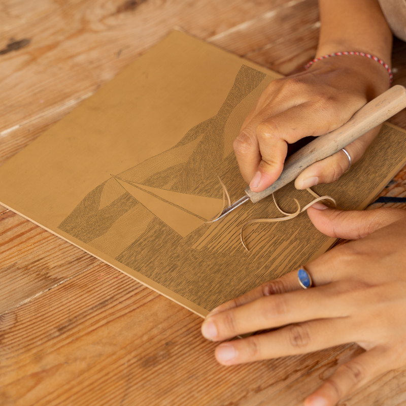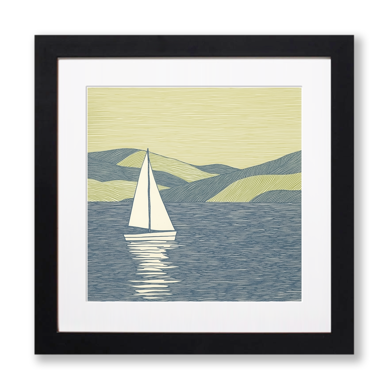 Bring the peaceful beauty of the Lake District into your home with this stunning lino-print style artwork featuring a sailing boat silhouette on tranquil waters. The composition perfectly captures the essence of a calm day on one of the UK’s most beloved lakes. A single sailboat, rendered in crisp ivory lines, drifts gently on the shimmering water, its reflection softly mirrored below. The serene waters are depicted using intricate horizontal hatching in cool blue tones, contrasting beautifully with the stylised pale hills and layered landscape in the background. The rolling hills are shown in soft shades of sage and cream, with the sky above in a pale, textured wash of yellow. This print combines simplicity and sophistication, drawing on the traditional techniques of lino cutting to evoke a sense of nostalgia and timeless style. Available framed in classic black or white and in two square sizes—36cm or 46cm—this piece brings a fresh, modern twist to traditional British landscape art. For those who love to create, you can also download the source images including line drawings and initial sketches, so you can craft your own unique lino print at home. Perfect for lovers of sailing, the Lake District, and distinctive printmaking art.