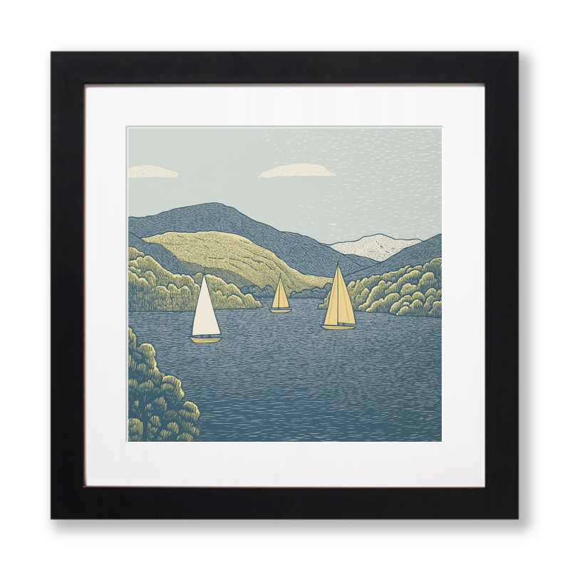 Bring the tranquil beauty of the Lake District into your home with this striking lino-print style artwork, featuring graceful sailing boats gliding across the serene waters of Lake Windermere. The design captures the timeless allure of the lake, with three crisp, elegant sailboats rendered in warm off-white and soft yellow tones, their sails reflecting on the richly textured, blue water. Surrounding the lake, lush, rolling hills of olive, sage, and muted green stretch into the distance, with mountain peaks and gentle clouds completing the idyllic landscape. Each mark and line is carefully crafted, evoking the tactile quality of traditional lino printing, while modern framing in your choice of black or white offers a clean, contemporary edge to the piece. Available in two square sizes, it’s perfect for any space, whether as a statement centrepiece or part of a gallery wall. Plus, our unique download option allows you to purchase the source images, including line drawings and original sketches, so you can create your own lino prints at home or use them for creative projects. Part of our exclusive Lake District Collection, this artwork makes a thoughtful gift for lovers of nature, sailing, or the British countryside. Celebrate the charm of Windermere every day with this calming, beautifully detailed print.