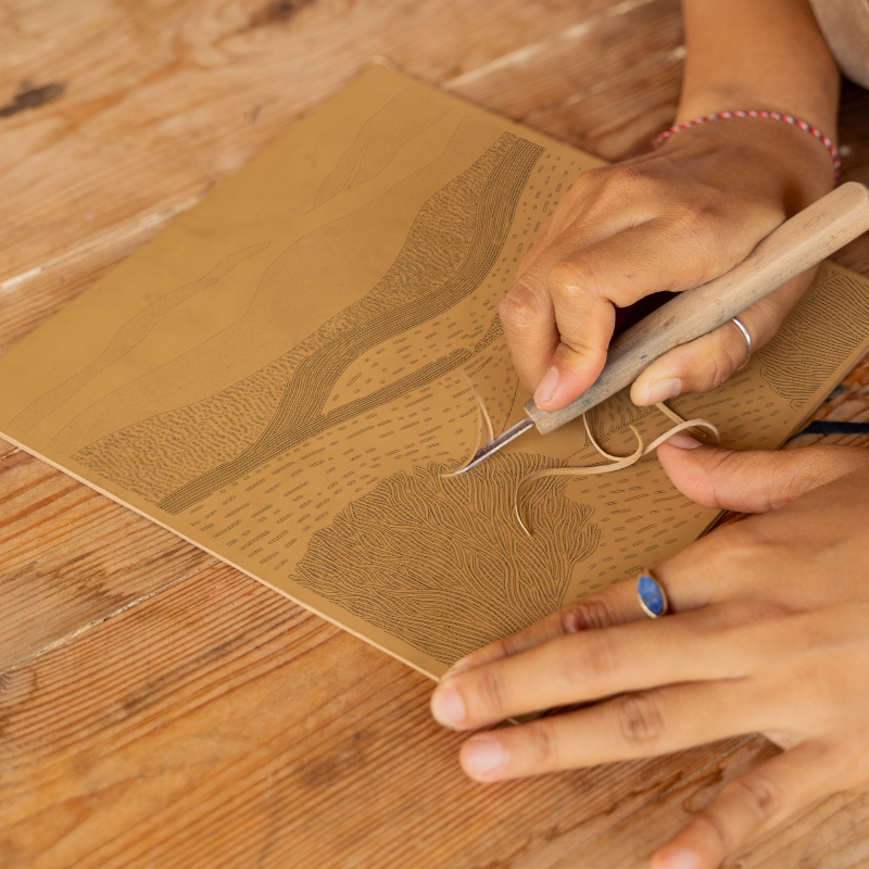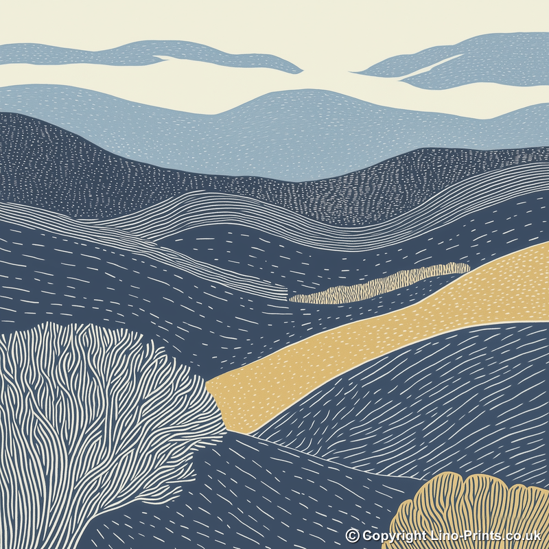 Capture the rugged beauty of the Lake District with our striking lino-print style artwork, ‘Scree Slope Pattern’. This piece encapsulates the undulating terrain of a classic Lake District scree slope, rendered in flowing, rhythmic lines that echo the movement of wind and time across the landscape. The scene is composed of overlapping hills, each defined by hand-carved line textures, which give the image an organic and tactile quality. Wide bands of slate blue and steel grey sweep across the frame, punctuated by warm ochre highlights representing sunlit paths or beds of scree gravel. The soft cream sky and blue-tinged clouds provide a gentle contrast, suggesting a calm, atmospheric day in the hills. At the foreground, stylised bushes or heather are illustrated in intricate lines, adding further depth and detail.