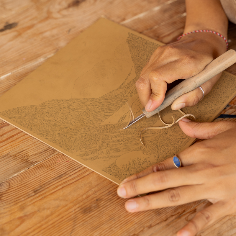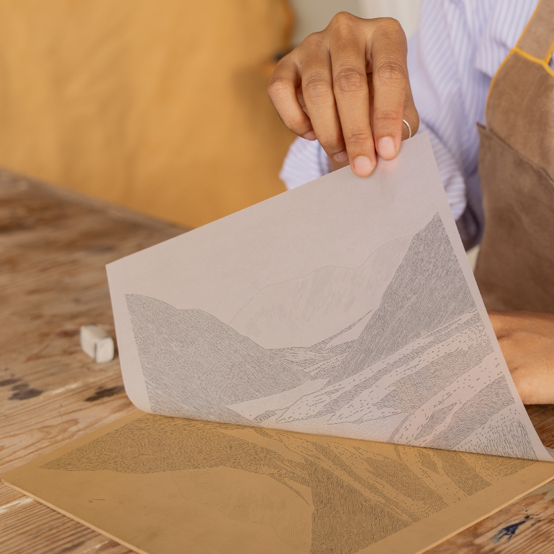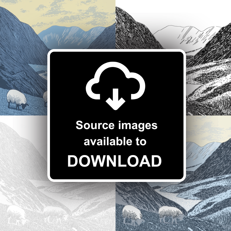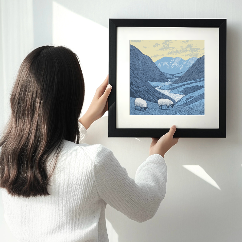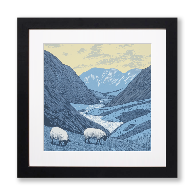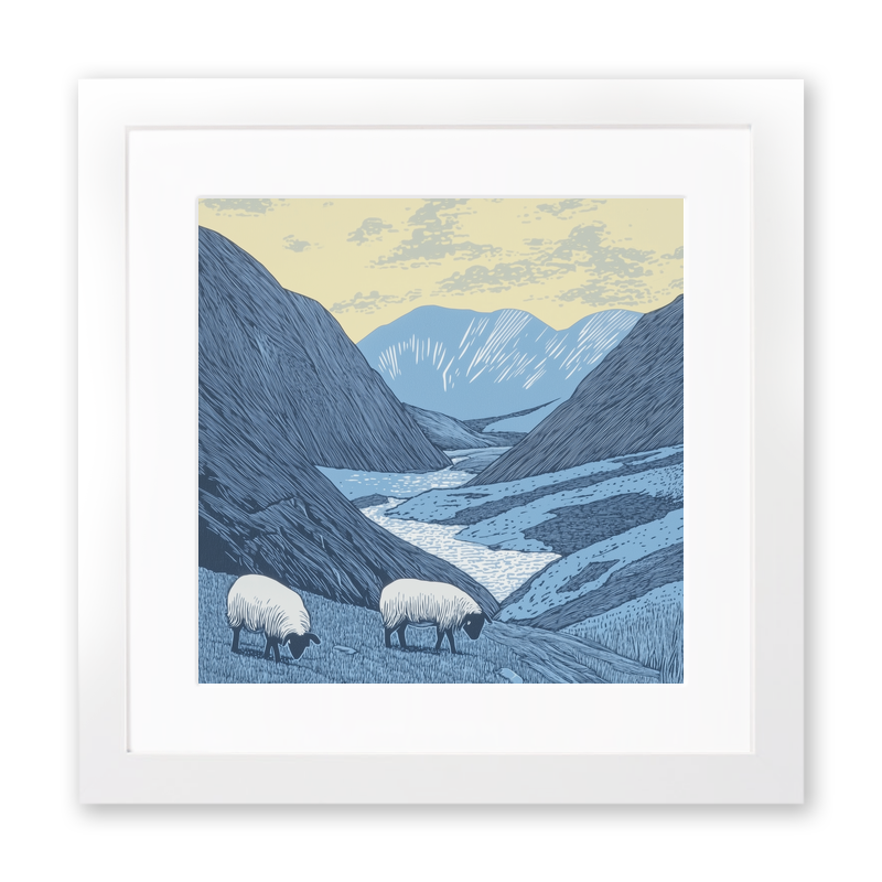 This striking artwork captures the serene beauty of the Lake District, featuring a pair of sheep grazing contentedly in the foreground below imposing, silhouetted crags. Executed in a distinctive lino-print style, the piece blends stylised textures and crisp linework to create a sense of depth and tranquility. Shades of deep and pale blue dominate the landscape, from the rolling hills and rocky mountains to the gentle flowing river which meanders through the centre of the scene. The sheep, with white and grey fleeces and dark faces, provide a gentle but striking contrast against the cool tones of the terrain. Overhead, a pale yellow sky adorned with soft, textured clouds evokes an early morning or late afternoon glow, enhancing the peaceful mood. Each print is expertly framed in your choice of black or white, available in 36cm or 46cm square, making it an ideal piece for any room. For those who love to be creative, we also offer a unique digital download package that includes the source images, linework, and sketches so you can create your very own lino print at home. Celebrate the quiet majesty of the Lake District and bring a touch of countryside charm to your space with this distinctive artwork.