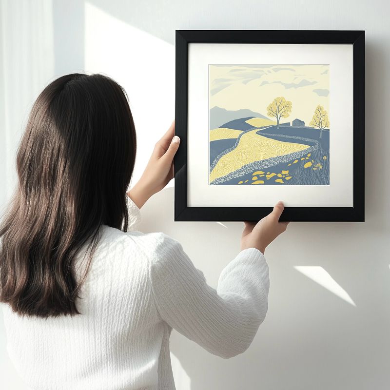Celebrate the enduring beauty of the Lake District with this evocative lino-print style artwork, depicting a traditional Sheepfold stone enclosure set amidst gently rolling hills. This piece captures the tranquil, timeless charm of the Cumbrian landscape, featuring sweeping yellow fields bordered by dry stone walls that curl elegantly through the composition. Two stylised trees with delicate yellow-leafed branches flank a classic stone-built barn, while distant fells create a sense of depth and serenity in the background. Defined by bold, expressive linework and a harmonious palette of soft yellows and muted slate grey-blues, the artwork brings the rugged textures and peaceful atmosphere of the Lakes into any space. Meticulously designed in a contemporary lino-cut style, this print is available framed in either black or white, with a choice of 36cm or 46cm square sizes. For creative souls, our unique offer allows you to purchase and download the source imagery, including line drawings and original sketches, so you can craft your very own lino print at home. Whether as an artistic centrepiece or a thoughtful gift for lovers of the British countryside, this beautiful Lake District Sheepfold print embodies the essence of rural England in every sense.