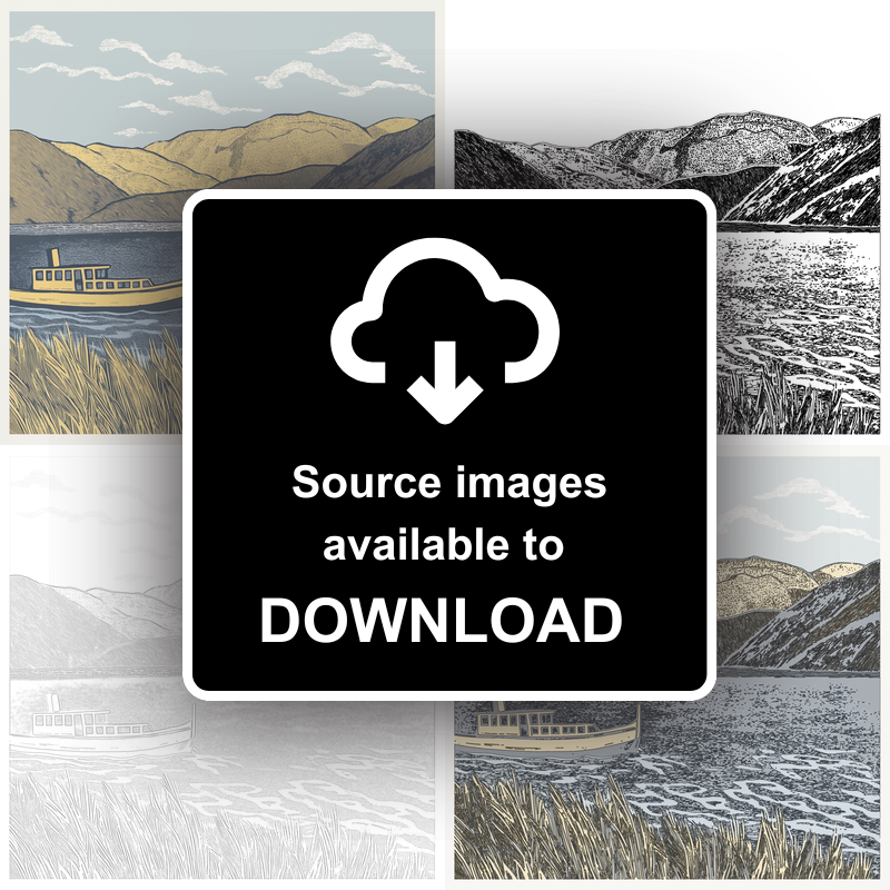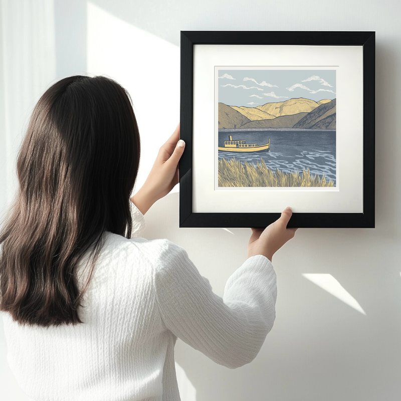 Celebrate the timeless beauty of the Lake District with this stunning lino-print style artwork depicting the iconic Steam Yacht Gondola gently gliding across Coniston Water. The scene draws you in with its bold, hand-carved lines and evocative use of colour, capturing the serene charm and grandeur of this beloved landscape. In the foreground, detailed grasses sway along the shoreline, their yellow and ochre hues contrasting beautifully with the deep indigo blues of the tranquil lake. The famous steam yacht is depicted in a warm, soft yellow, its elegant form reflecting on the water’s textured surface. Behind, dramatic mountains rise and fall in layers of ochre, brown, and slate-blue, standing majestic beneath a sky softly patterned with stylised, cloud-dappled blue. This print is not only a joyous tribute to the Lake District’s scenic splendour, but also to traditional printmaking artistry—it looks beautiful in both black and white frames, and is available in 36cm or 46cm square sizes. For those who love to get creative, we offer downloadable source files including line-drawings and sketches, so you can create your own lino print inspired by this captivating view. Perfect for lovers of the lakes, landscape art enthusiasts, or anyone looking to bring a touch of tranquil British scenery into their home, this unique artwork promises to enchant for years to come.