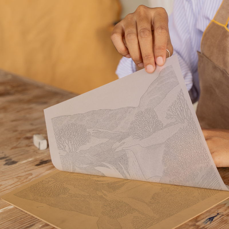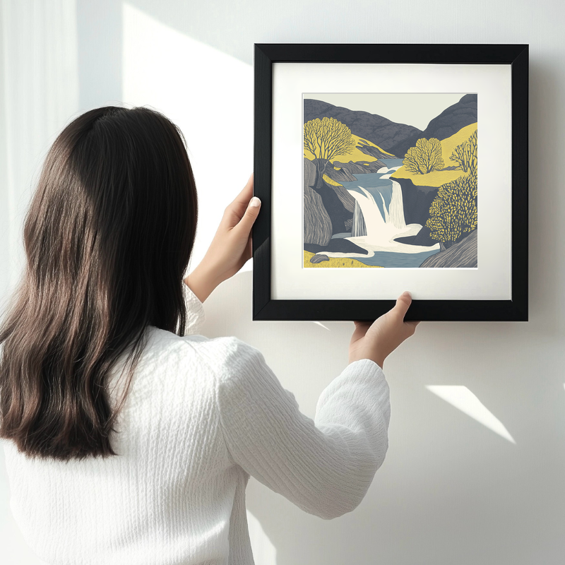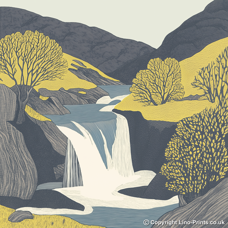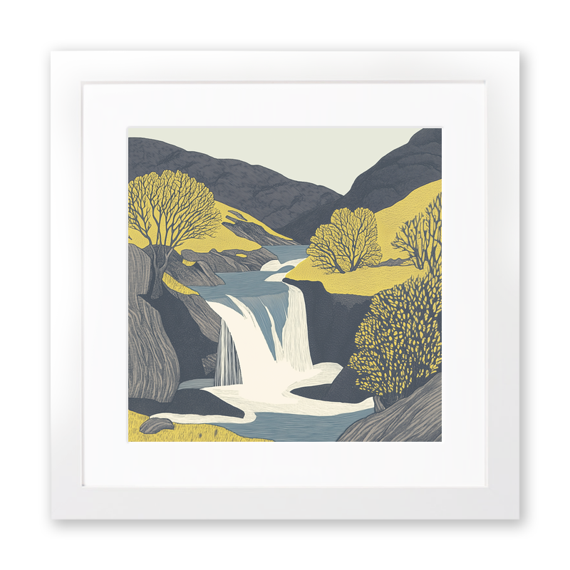 Celebrate the tranquil beauty of the Lake District with this striking lino-print style artwork of Stock Ghyll Force waterfall. Expertly rendered to capture the flowing energy of one of Ambleside’s most beloved natural attractions, this piece features elegant, stylised lines that evoke the texture and charm of traditional printmaking. The scene showcases the cascade of cool, blue-tinted waters as they tumble powerfully between craggy rock faces, framed by gracefully sculpted trees with delicate, fine-lined branches. Surrounding the falls are rolling hills and plateaus, depicted in soft golden yellow, conveying a sense of calm and open space so evocative of the Lake District’s countryside. The limited colour palette – soft cream, muted blue-grey, subtle charcoal, and warm ochre – ensures this artwork is both modern and timeless, seamlessly fitting into any setting, whether contemporary or classic in style.