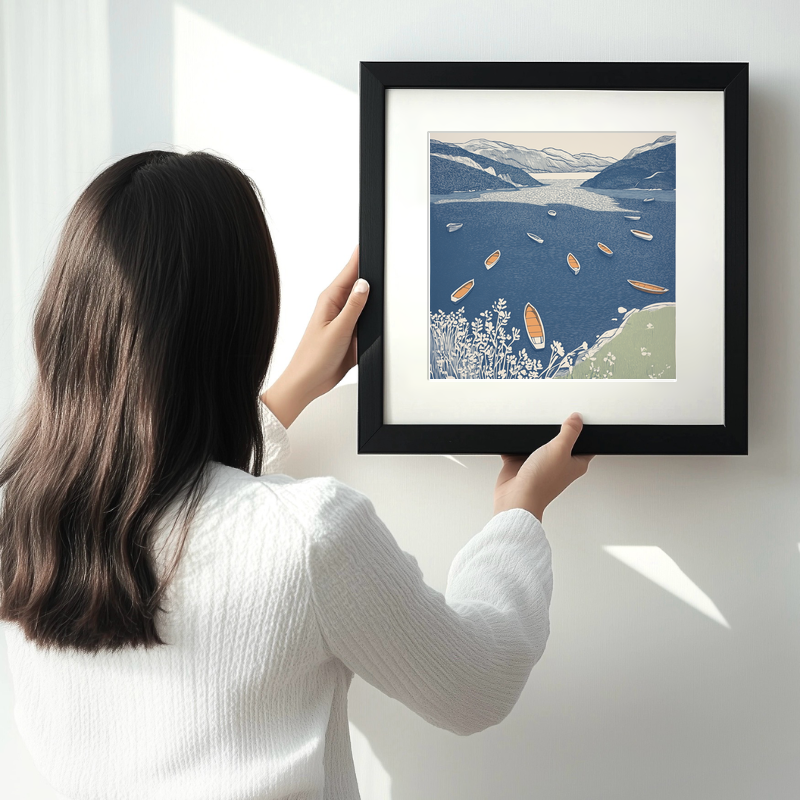 Bring the tranquil beauty of the Lake District into your home with this exquisite lino-print style artwork, 'View of Lake Boats from Above.' This piece captures an enchanting aerial perspective of classic rowing boats gently floating on a serene lake, their ochre interiors standing out against the deep blue water. Crisp white outlines and delicate textural lines evoke the traditional craft of lino printing, adding tactile interest and charm.