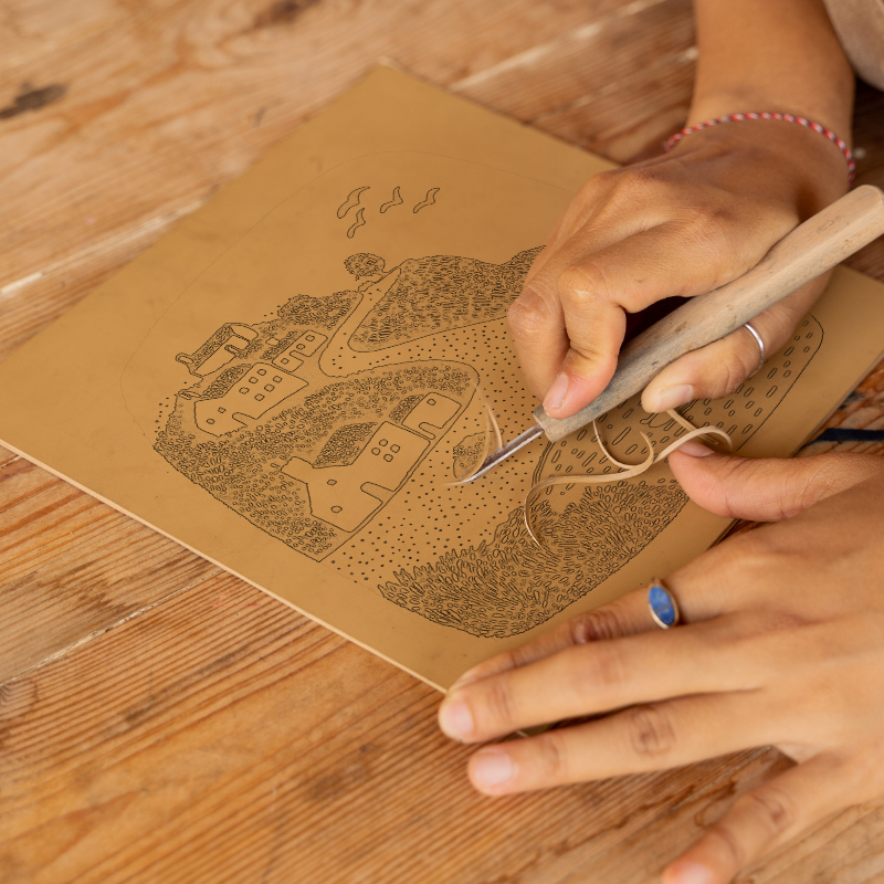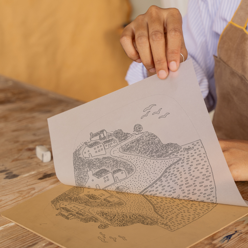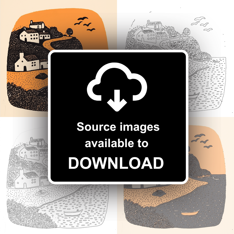 Experience the charm of Cornwall with our lino-print style artwork featuring Coverack, part of the 'UK Picturesque Harbours and Beaches' collection. This exquisite piece captures a quaint coastal village scene, illustrating a serene bay with gentle waves lapping against the shore. The artwork features quaint houses perched on a rolling hill, overlooking the scenic sea. Curved pathways meander between the buildings, adding a rustic feel. The use of rich black ink outlines and detailed textures contrasts beautifully with vibrant orange, creating a warm and inviting atmosphere. Gulls soar in the sky, and a lone boat floats in the harbour, evoking a sense of tranquility. Available in elegant black or white frames, this artwork is perfect for any home, adding a touch of nautical charm. Alternatively, purchase and download the source images including line drawings and sketches to create your own prints.