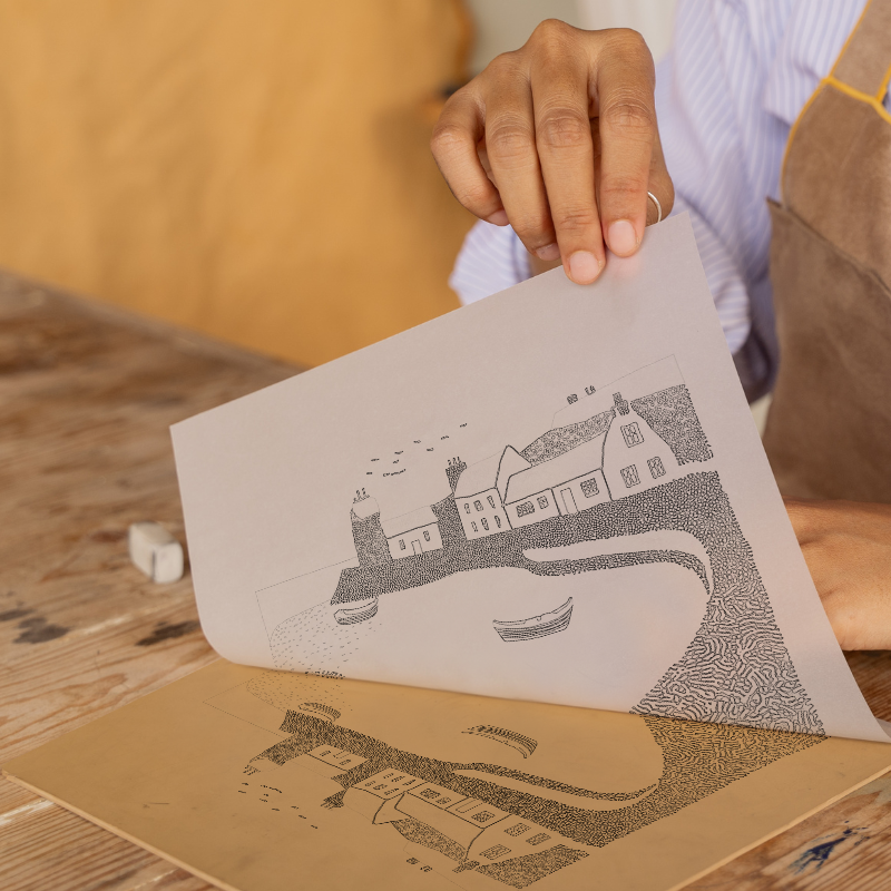 Capture the serene beauty of Dunbar Harbour, East Lothian with this stunning lino-print style artwork. This piece is part of our exclusive 'UK Picturesque Harbours and Beaches' collection and brings the tranquil charm of coastal Scotland into your home. The artwork depicts an idyllic harbour scene with quaint cottages and boats set against a backdrop of rolling hills and a vast sky. The textured patterns in the water and land are rendered in rich blacks, creating a striking contrast with the vibrant orange rooftops and the serene blue of the sky. The composition leads the eye through the winding path of the harbour, inviting you to step into a world of coastal tranquillity. Available in a choice of black or white frames, in either 36cm or 46cm square sizes. Additionally, unleash your creativity with the option to purchase and download the source images, line drawings, and sketches to create your own lino prints. Bring a piece of the UK's picturesque harbours into your space with this beautifully crafted artwork.