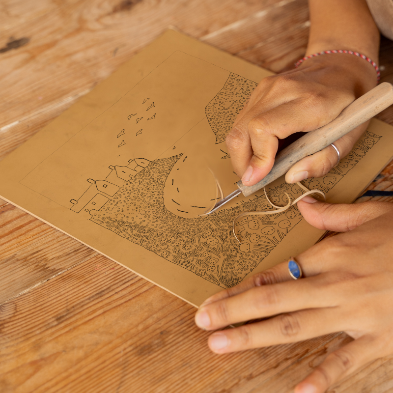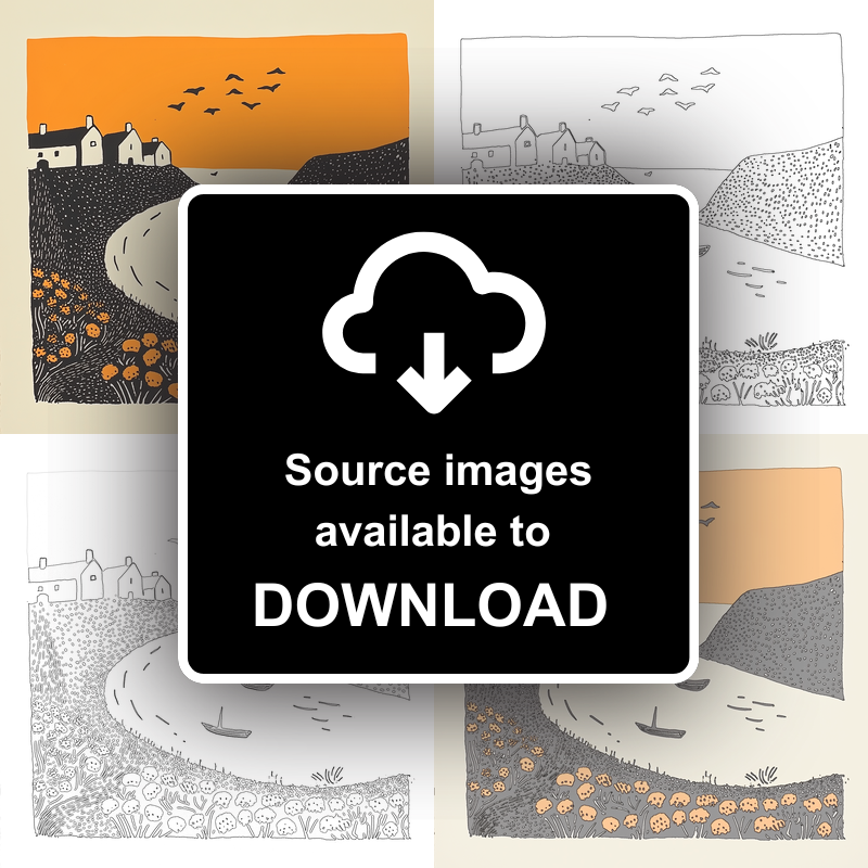 Explore the serene beauty of Looe Harbour, Cornwall, with this exquisite lino-print style artwork. This piece captures the essence of the UK’s picturesque harbours and beaches, featuring a quaint seaside village. The artwork portrays charming white cottages nestled along the rugged coastline. The calm waters of the harbour are dotted with little sailing boats, offering a touch of maritime tranquillity. Above, a bright orange sky provides a stunning backdrop, mirroring the vibrant wildflowers that dot the foreground. A flock of birds glides gracefully across the sky, adding a sense of movement and freedom. The bold black contours and the striking contrast of orange and cream create a visually captivating composition. Available in a 36cm or 46cm square black or white frame, this piece will become a focal point in any room. For those inspired by its beauty, you can purchase and download the source images, including line drawings and sketches, to create your own lino print masterpiece.