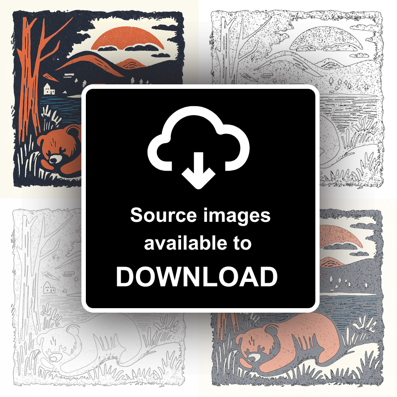This charming lino-print style artwork, titled "Cute Bear Cub," is part of our beloved Cute Animals collection. A delightful bear cub rests outdoors, adding a touch of warmth and whimsy to any space. The print captures a tranquil landscape with the cub cozily nestled by a tree, silhouetted against a serene lake with gentle waves. In the distance, rolling hills and quaint cottages sit beneath a vibrant sunset, all rendered in a harmonious blend of colours. The sun is setting against a backdrop of the evening sky, adding a magical glow to the scene. The artwork is available framed in stylish black or white, in two sizes: 36cm or 46cm square. For those with a DIY spirit, we provide the unique option to purchase downloadable source images, including line drawings and sketches, allowing you to create your own personalized lino print. Enhance your home with this adorable tribute to nature's beauty.
