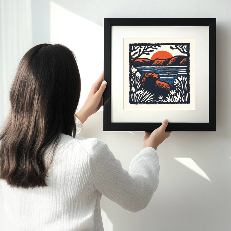 Delight your space with our lino print style artwork featuring an adorable bear cub, part of the "Cute Animals" collection. This charming piece captures the serene innocence of a bear cub nestled in a picturesque landscape. The artwork is framed in either sleek black or classic white, available in 36cm or 46cm square dimensions. The scene is set against a vibrant red sunset, with a tranquil blue river flowing through the valley, flanked by mountains. The cub rests comfortably within lush foliage, rendered in exquisite detail with strong, flowing lines. The piece evokes a sense of tranquility and joy, perfect for adding warmth to any room. Additionally, for creative enthusiasts, the original line drawings and sketches are available for download, allowing you to craft your own lino prints. Embrace nature’s beauty with this endearing artwork today.