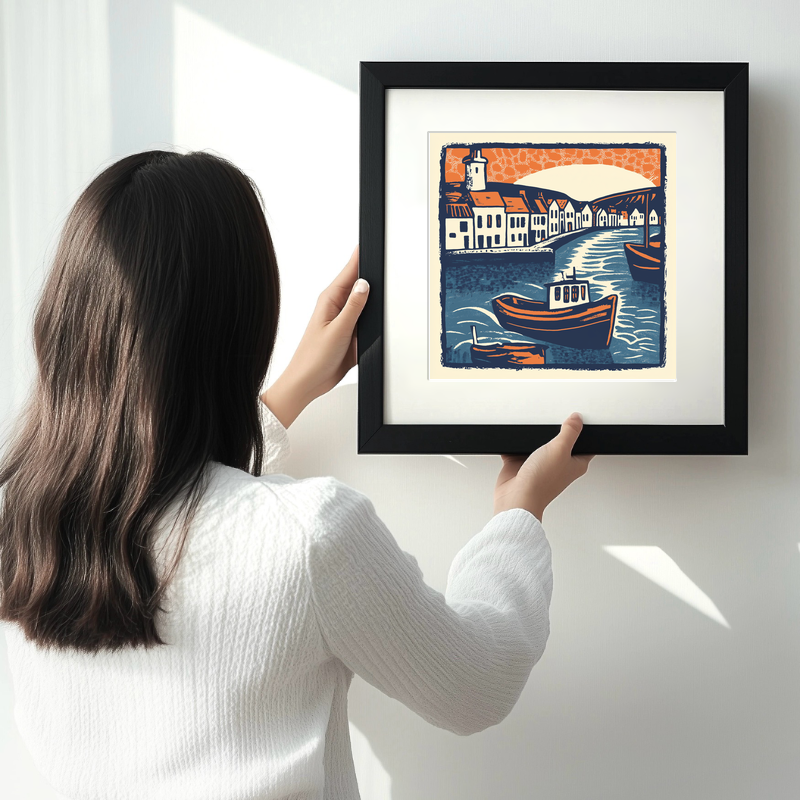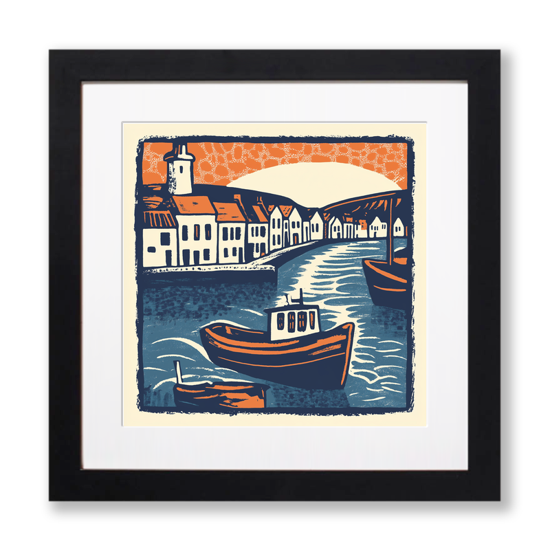 Experience the charm of Cornwall with our Mevagissey Harbour linocut style print, available in both 36cm and 46cm square frames, in classic black or white. This piece beautifully captures the quintessential essence of this iconic harbour town. Vibrant orange and rich navy hues contrast against the cream background, illustrating the serene waters and distinctive village architecture. The bustling harbour scene features quaint white houses lining the water's edge, crowned by the commanding presence of a historical tower. Boats sway gently on the dreamy blue waves beneath an artistically speckled sky, highlighted by a brilliant expanse of orange and cream. Each print is a piece of art that brings the tranquillity and heritage of Cornwall into your space. For a personalized touch, download the digital source files and explore the craft of lino printing yourself. Perfect for art enthusiasts and Cornwall admirers alike.