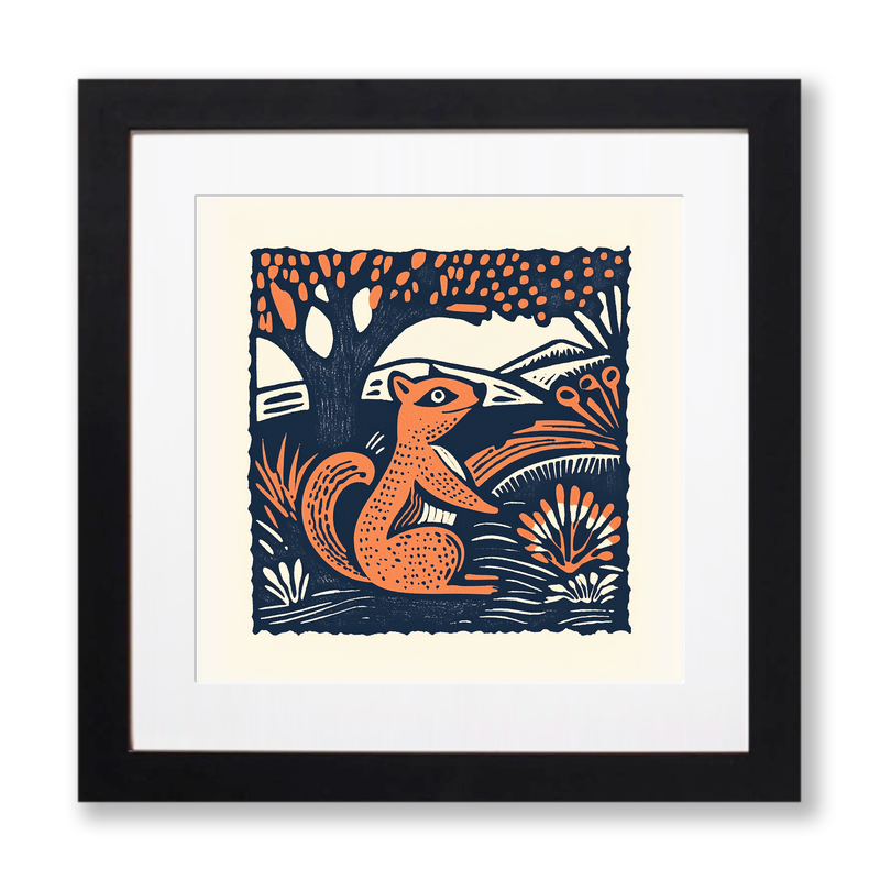Embrace the charm of wildlife with our Cute Chipmunk lino-print style artwork, part of the delightful Cute Animals collection. This captivating piece features a whimsical chipmunk, artfully rendered in a rich combination of navy blue and warm orange. The chipmunk sits amidst a beautifully detailed forest scene, surrounded by stylised flora and rolling hills. The texture and movement in the print evoke the timeless technique of traditional lino cutting, capturing the essence of nature. Available in framed options of black or white, and sizes of 36cm or 46cm square, this versatile artwork will enhance any space with a touch of playful elegance. For those creative at heart, opt for our unique downloadable package, including the source images and intricate line drawings, allowing you to craft your own lino print masterpiece at home. Elevate your decor with this enchanting tribute to woodland life.