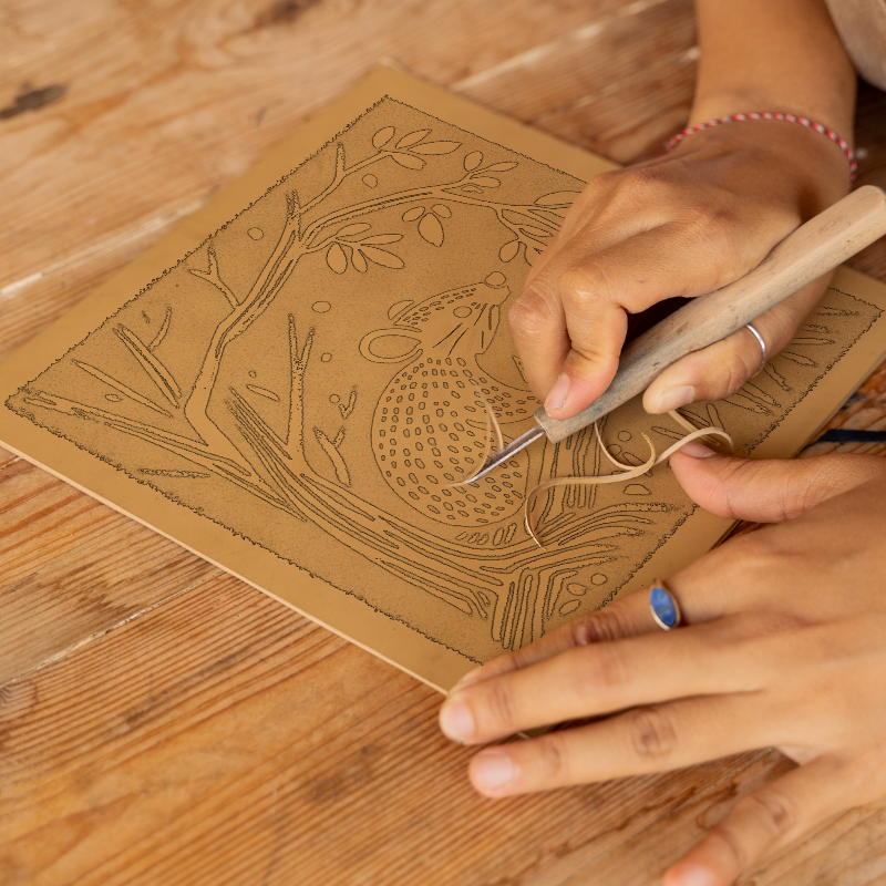 Our charming "Cute Dormouse" artwork evokes the delicate beauty of nature through a lino-print style. This whimsical piece captures the dormouse nestled among branches and leaves, creating a sense of tranquility and innocence. The dormouse is illustrated in warm, earthy tones of orange and beige, sitting upon a serene log wrapped in gentle foliage. Leaves and berries surround the dormouse, adding depth and a whimsical touch. Executed with a distinctive lino-print aesthetic, the artwork presents an alluring contrast of colours, featuring a rich navy background that makes the imagery pop. Available in 36cm or 46cm square, each print is elegantly framed in your choice of black or white. For a truly unique experience, customers can also purchase and download the original line drawings and sketches to craft their own lino prints at home. Part of our "Cute Animals" collection, this piece adds a touch of nature and whimsy to any space.