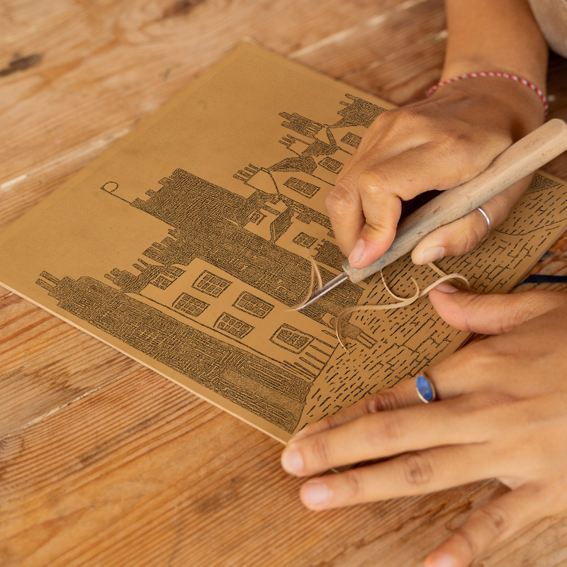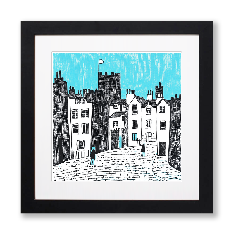 Immerse yourself in the charm of Edinburgh's historic beauty with this captivating piece of lino-print style artwork featuring Edinburgh Castle and the Royal Mile. This artwork, part of our "Architecture & Cityscapes" collection, beautifully captures the essence of this iconic location. The scene is depicted in monochrome with a striking blue sky, highlighting the detailed rooftops and charming windows of the old-world buildings. The winding cobbled street adds depth and invites the viewer to explore the rich history embedded in every corner of Edinburgh. Available in both 36cm and 46cm square frames, choose your preferred black or white framing to complement your decor. Add a unique touch to your collection with the option to purchase and download the source images, including line drawings and sketches, enabling you to create your own lino prints. Experience the timeless allure of Edinburgh from the comfort of your home with this exquisite piece.