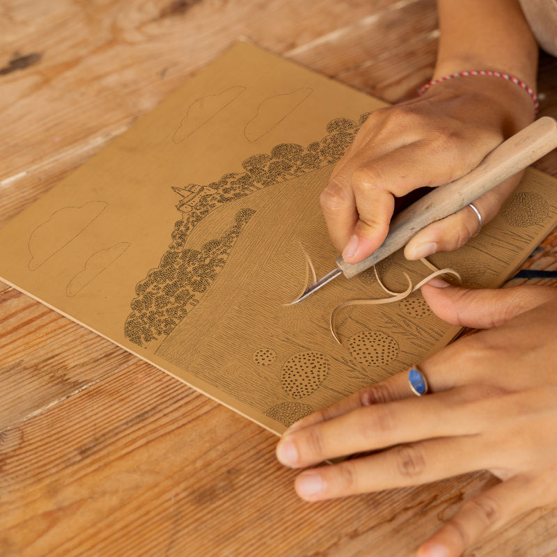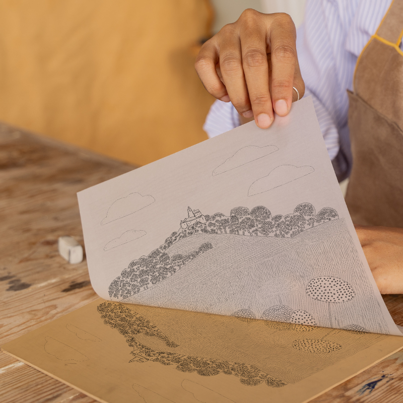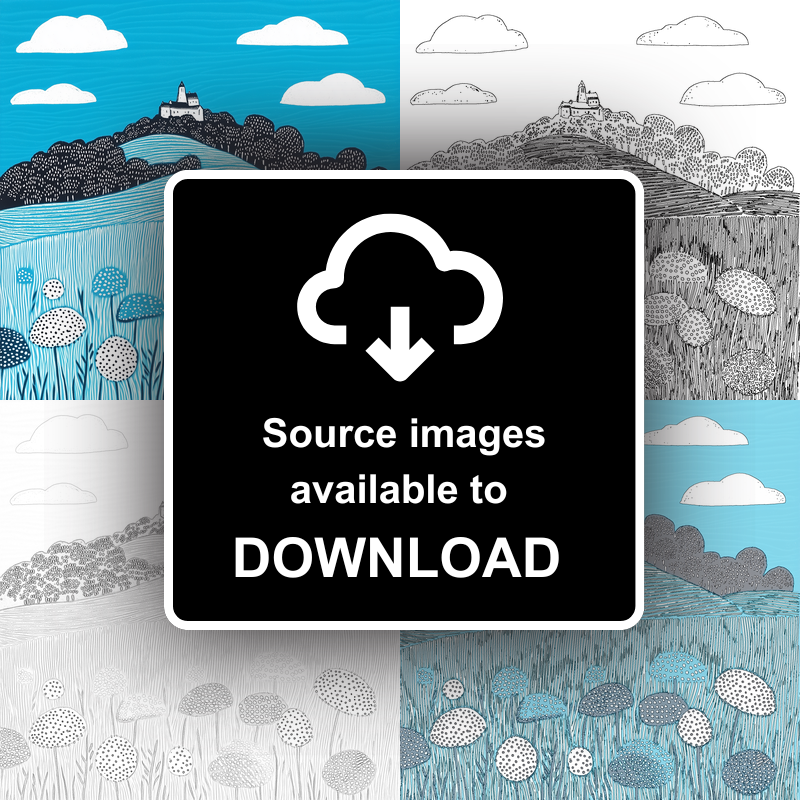 This exquisite lino-print style artwork captures the tranquillity and majesty of St Michael’s Mount in Cornwall. The piece is dominated by vibrant shades of blue and white, creating a serene and eye-catching visual experience. The sky, painted in a bright cerulean, is speckled with soft, fluffy white clouds, providing a gentle backdrop. Below, the landscape unfolds with rolling hills and clusters of intricately detailed foliage drawn with bold black and white textures, reminiscent of natural patterns found in linocut prints. In the foreground, a field of stylised, dotted wildflowers adds a whimsical touch with their varied patterns and shapes, resonating in harmony with the rest of the composition. The silhouette of the Mount's distinctive castle-like structure is perched atop the hill, grounding the scene with a sense of local charm and history. This artwork is expertly framed, available in elegant black or white, and comes in both 36cm and 46cm square options, making it a versatile addition to any space.