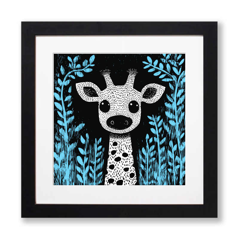 Introducing our charming 'Cute Giraffe Calf' lino-print style artwork, a delightful addition to any space. Part of our beloved Cute Animals collection, this piece highlights the irresistible appeal of a young giraffe. The artwork features the playful portrayal of a giraffe calf with a series of intricate line drawings, capturing the essence of its innocent gaze and delightful features. Its towering neck and curious eyes are set against a striking backdrop of lush foliage, represented in a monochrome pattern with hints of bold azure blue. Professionally framed in either sleek black or pristine white, this print is available in both 36cm and 46cm square formats, making it a versatile choice for any room. Additionally, you can purchase the digital files, enabling you to create your own art at home. This piece is perfect for animal lovers and those who appreciate distinctive, handcrafted art.