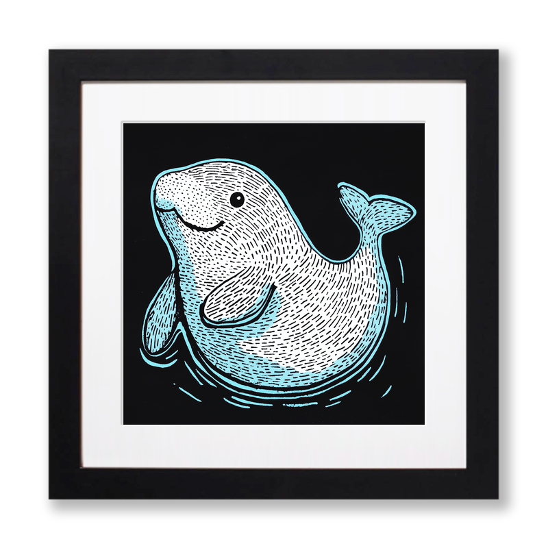 Our prints are available in a choice of black or white frames, adding a sleek finish to your decor. Each frame is offered in two sizes, 36cm or 46cm square, fitting seamlessly into any space. For those with a creative flair, we provide an exclusive option to purchase and download the source images, including line drawings and sketches, to create your own lino prints at home. Bring this adorable marine creature into your living space, capturing the beauty of the ocean with each glance.
