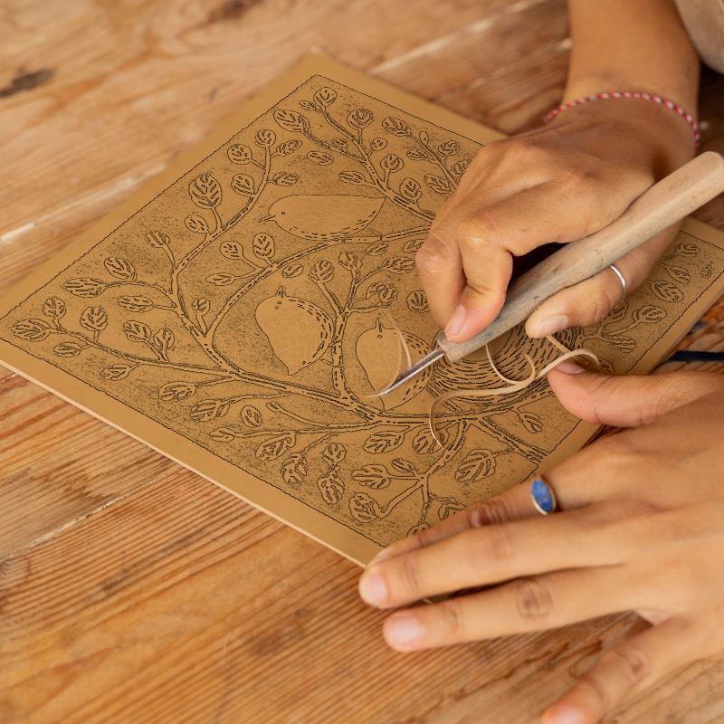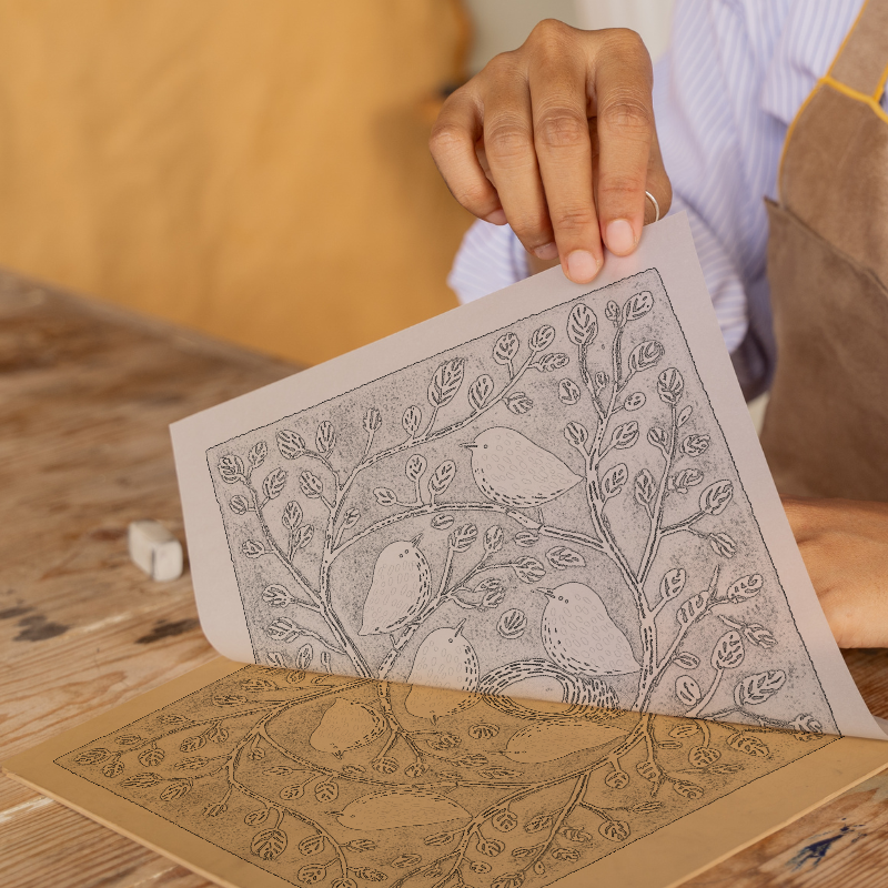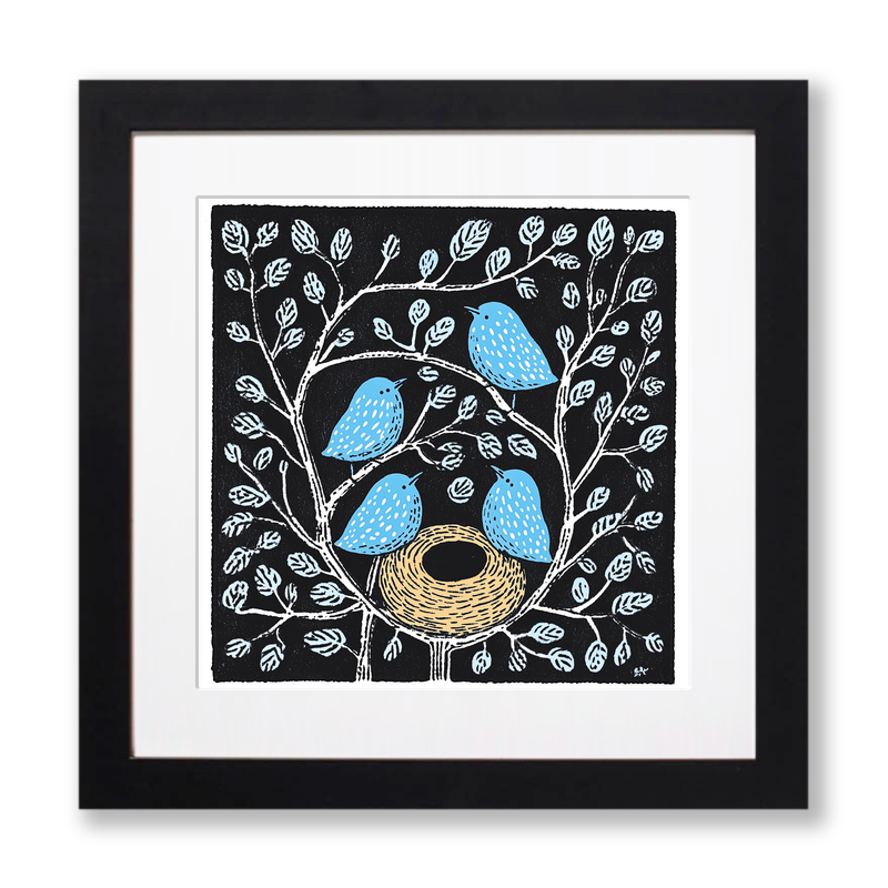 Explore the serene beauty of nature with our exquisite lino-print style artwork, featuring a captivating depiction of brambles embracing a family of nesting birds. This piece, part of our Nature & Wildlife collection, captures the harmonious interplay of wildlife and flora. The artwork showcases three vibrantly blue birds perched delicately on intricately detailed branches, enveloping their cosy nest. The branches, depicted with intricate white linework, weave through the artwork, creating a sense of depth and tranquillity against a deep black background. The comforting warmth of the golden nest adds a delightful contrast, bringing the scene to life. Measuring 36cm or 46cm square, and framed in your choice of black or white, this piece will be a striking addition to any space. Additionally, you can purchase and download the source images, including detailed line drawings and sketches, perfect for your own lino-printing projects, granting you a unique creative experience.
