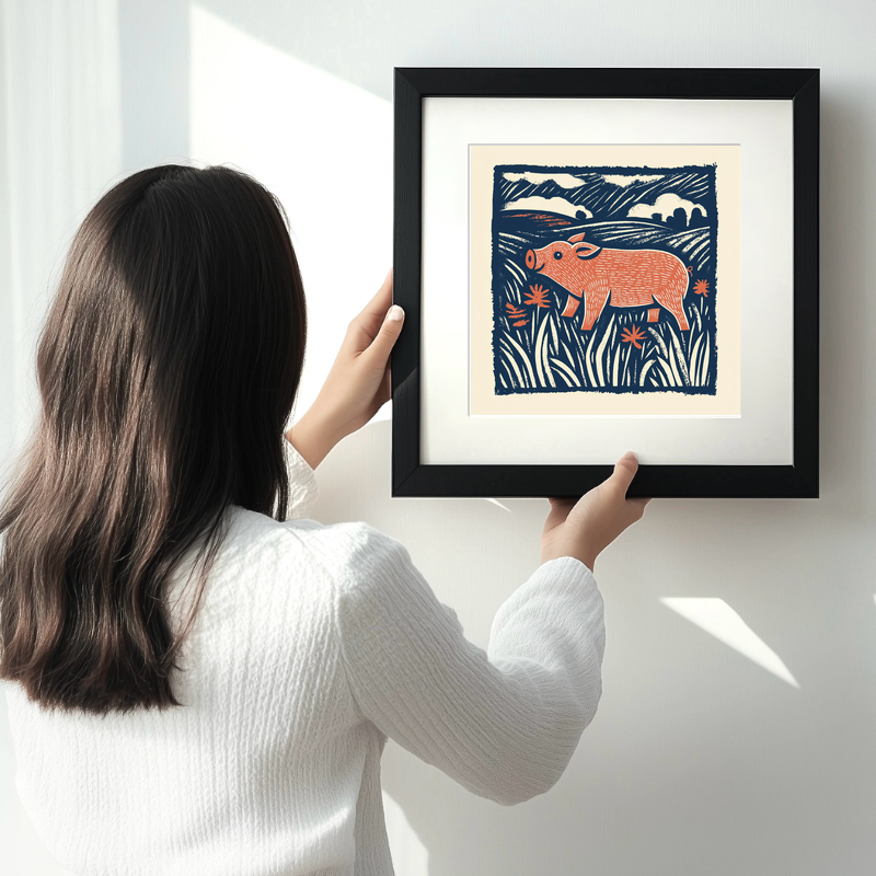 Introducing our delightful 'Cute Piglet' print, an exquisite piece from the Cute Animals collection. This artwork captures the innocence and charm of a young piglet, rendered in a traditional lino-print style. With meticulous detailing, the piglet is depicted frolicking through a vibrant landscape, surrounded by elegant grasses and cheerful flowers. The use of bold, contrasting colours creates a striking image that radiates warmth and joy. Available framed in sleek black or white, this piece measures either 36cm or 46cm square, making it a stunning focal point in any space. For those with a creative spark, we're offering the unique opportunity to download the source images, including line drawings and sketches, enabling you to craft your own lino prints. Add this charming piglet print to your collection today, and bring a touch of playful elegance to your home.