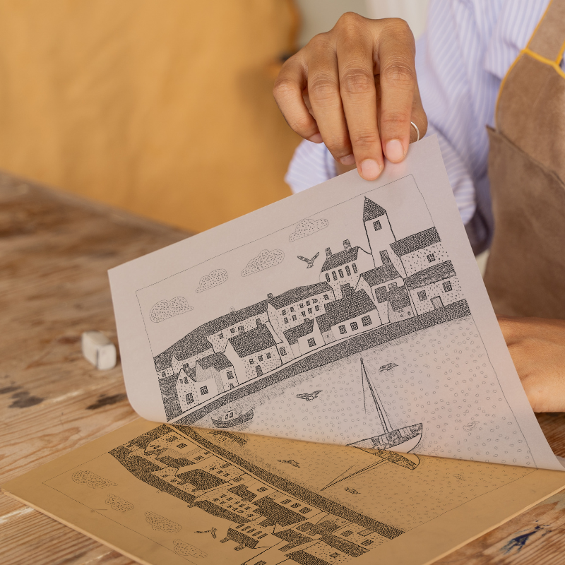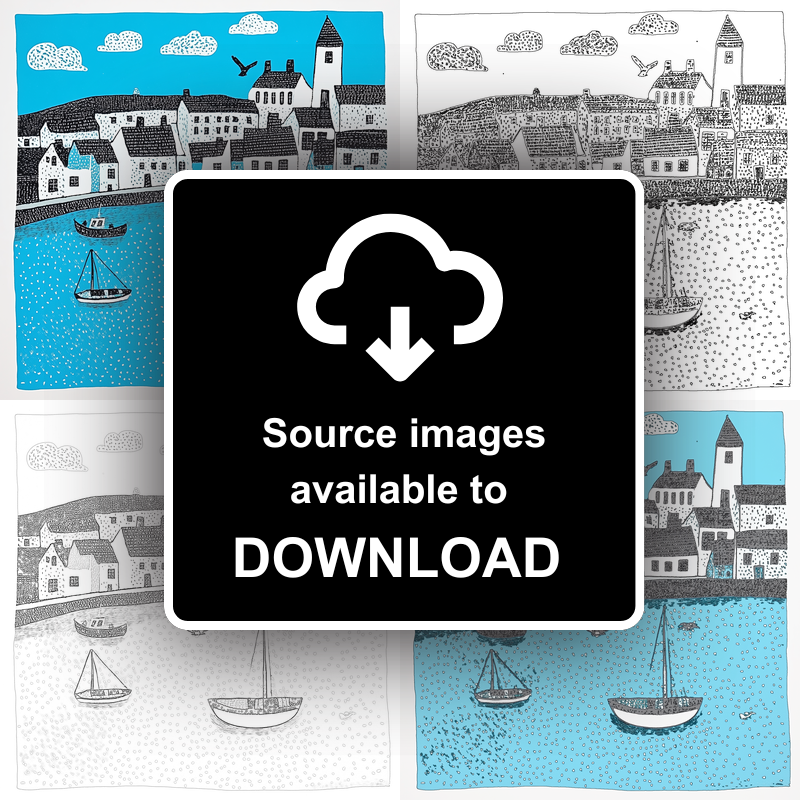 Capture the charm of Brixham Harbour, Devon with our exquisite lino-print style artwork, part of the UK Picturesque Harbours and Beaches collection. This piece beautifully illustrates the lively spirit of a coastal town, showcasing a serene harbour scene. The turquoise waters are dotted with quaint sailing boats, under a sky of fluffy clouds and playful birds. Each building is meticulously detailed with intricate black and white patterns, creating a bold contrast against the vibrant blue background. This artwork is available framed in your choice of black or white, in dimensions of 36cm or 46cm square. For art enthusiasts and creative souls, we also offer the unique option to purchase and download the source images, including line drawings and sketches, to create your own lino print masterpiece. Embrace the beauty of Brixham Harbour in your home with this stunning piece.