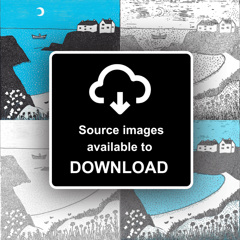 Capture the serene beauty of Cemaes Bay, Anglesey with this exquisite lino-print style artwork from our UK Picturesque Harbours and Beaches collection. The print presents a tranquil night scene, beautifully illustrating the serene bay under a crescent moon. The clear blue sea, dotted with a small boat, reflects the gentle light, while the stark black cliffs frame quaint seaside cottages. Nestled against the light sky, the intricate line work captures the charm and stillness of a coastal retreat.