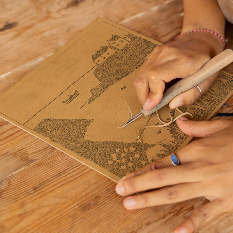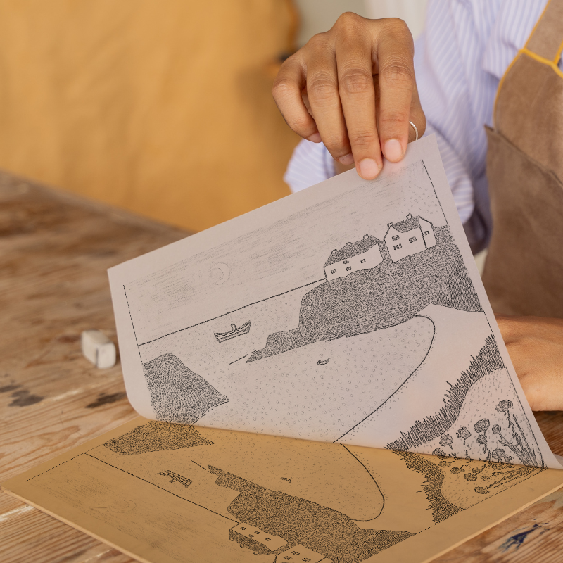 The sandy shore in the foreground is punctuated with wildflowers and grasses, adding a touch of organic texture. Available in either 36cm or 46cm square frames in black or white, this print can effortlessly complement any room’s decor. Additionally, our unique digital option allows you to purchase and download the source images, so you can create your own lino-print masterpiece at home. Embrace the quaint charm of Cemaes Bay and bring a part of Anglesey into your living space.