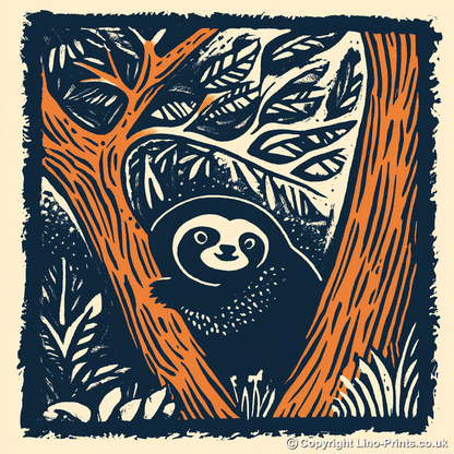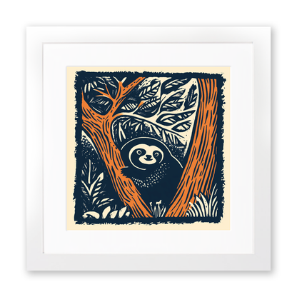 This charming lino-print style artwork features an adorable sloth nestled among the trees, perfect for adding a touch of whimsy to your space. The sloth, with its endearing smile and gentle expression, is enveloped in a vibrant forest setting. Richly detailed, the image captures the essence of tranquillity and nature's beauty. The striking contrast between the dark navy and terracotta hues vividly brings the scene to life. Lush foliage surrounds the playful creature, creating an inviting, immersive atmosphere. Part of our 'Cute Animals' collection, this piece is available in both black and white frames and in two sizes: 36cm and 46cm square. For those with a creative spirit, we offer the exclusive opportunity to download the artwork's source images, including line drawings and sketches, giving you the chance to craft your own unique lino print.